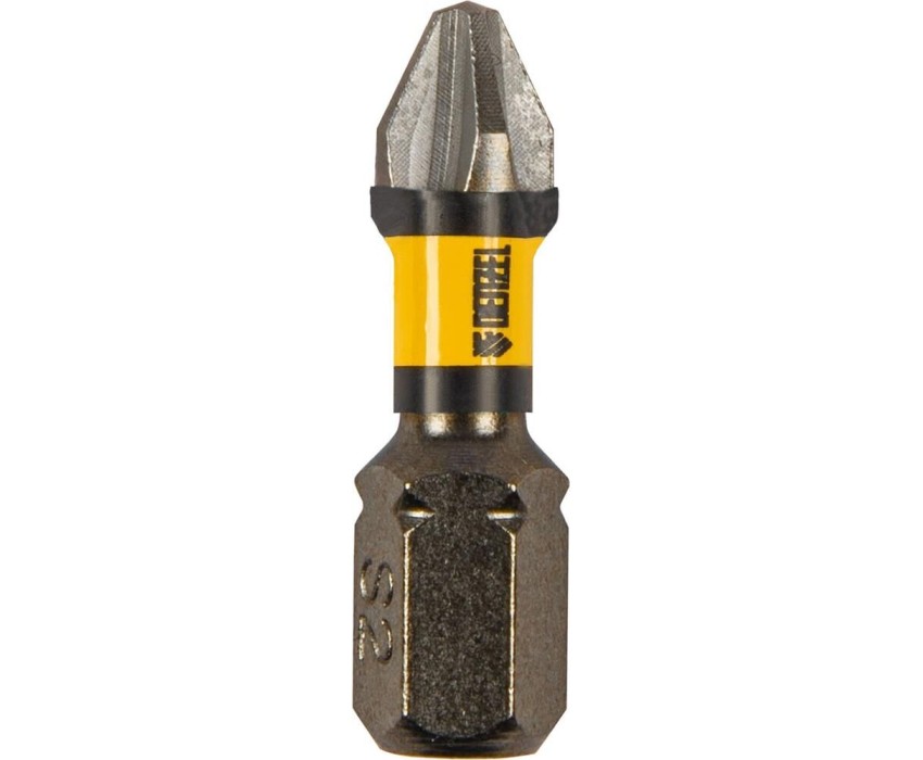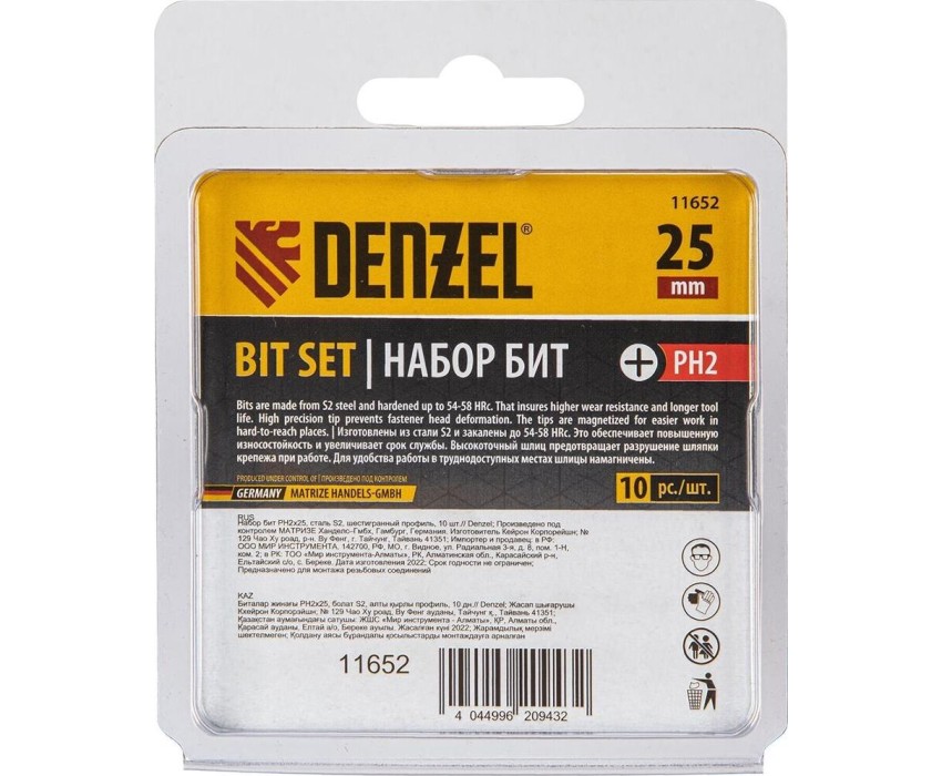 Набор бит PH2 х 25 мм Denzel 11652, из стали S2, состоит из 10 наиболее востребованных крестообразных насадок с хвостовиком 1/4" и предназначен для шуруповертов и отверток-адаптеров. Биты используются при монтаже и демонтаже большинства саморезов по дереву, шурупов и др. За счет оптимальной геометрии биты способны ввинтить и извлечь большое количество крепежа без потери рабочих свойств.ПреимуществаУстойчивость к деформации при высоких нагрузках — биты изготовлены из японской легированной стали S2 и закалены до твердости 58 HRC.Высокоточное исполнение — оптимальная геометрия шлица и максимальный контроль на производстве в Тайване позволили добиться выверенности каждой биты и предотвратить проскальзывание рабочей части в головке крепежа.Удобная эксплуатация — намагниченный шлиц облегчает работу и позволяет направлять шуруповерт с насаженным крепежом одной рукой, а другой придерживать закрепляемую деталь.Антикоррозионные свойства — никелированное покрытие увеличивает срок службы насадок.Защита от подделок — цветное кольцо с логотипом ТМ Denzel на каждой бите подтверждает оригинальность товара.10 бит в комплекте — набора хватит на целую бригаду.Удобная упаковка — набор поставляется в двойном блистере с европодвесом.