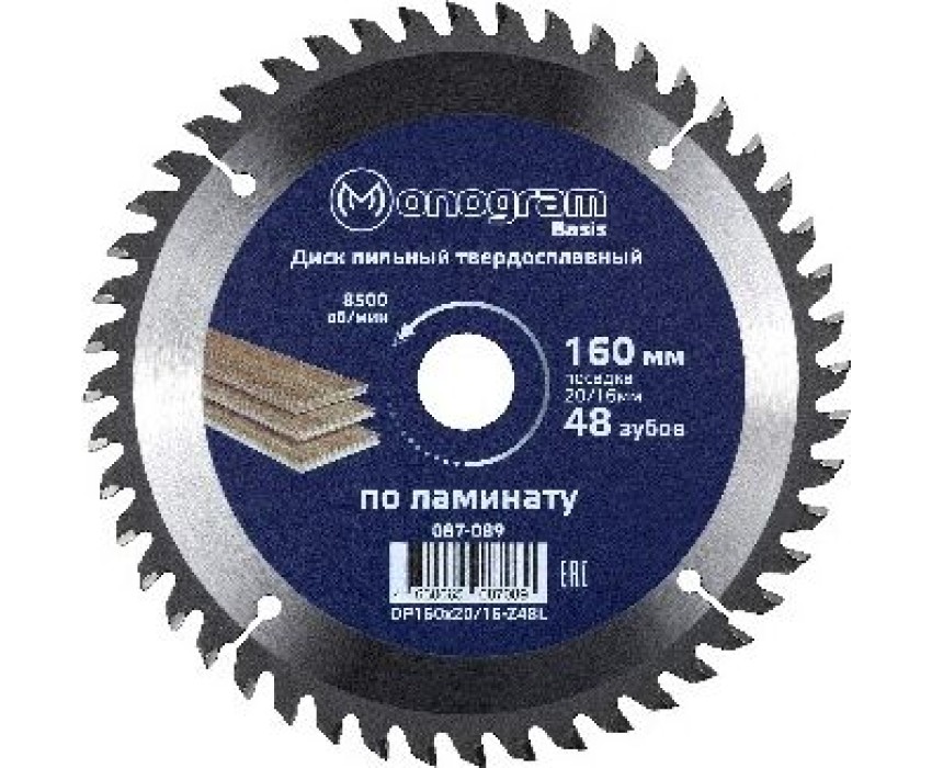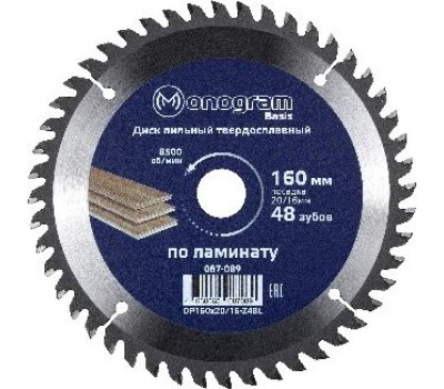 MONOGRAM (087-089) Диск пильный твердосплавный Basis 160х20/16мм, 48 зубов по ламинату, ЛДСП, чистов. пил.