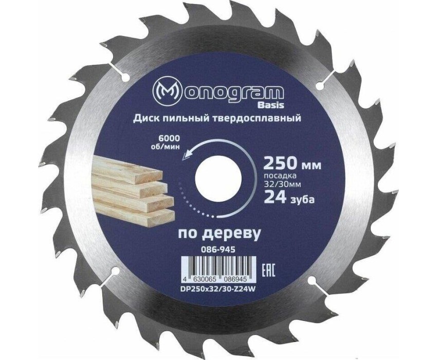 MONOGRAM (086-945) Диск пильный твердосплавный Basis 250х32/30мм, 24 зуба по дереву, ДСП, продольн. пил.