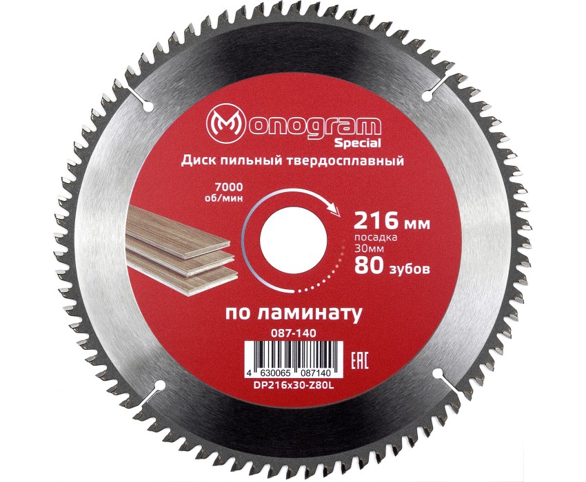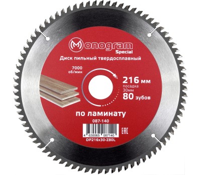 Диск пильный MONOGRAM (087-140) твердосплавный Special 216х30мм, 80 зубов по ламинату, ЛДСП, чистов. пил.