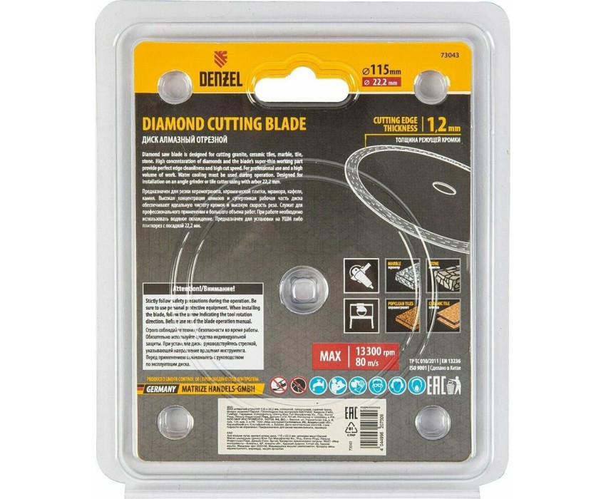 Алмазный диск ТМ Denzel "Сплошной" арт 73043, ф115 х 22,2 мм, предназначен для мокрого резания мрамора, керамогранита и керамическую плитки, камня. Устанавливается на УШМ (болгарку) или плиткорез с посадочным диаметром 22,2 мм. Высокая концентрация алмазов и супертонкая рабочая часть диска обеспечивает идеальную частоту кромок и высокую скорость реза.Диск произведен по технологии горячего прессования с увеличенной шириной режущей кромки (10мм) подходит для профессионального использования и больших объемов работ.