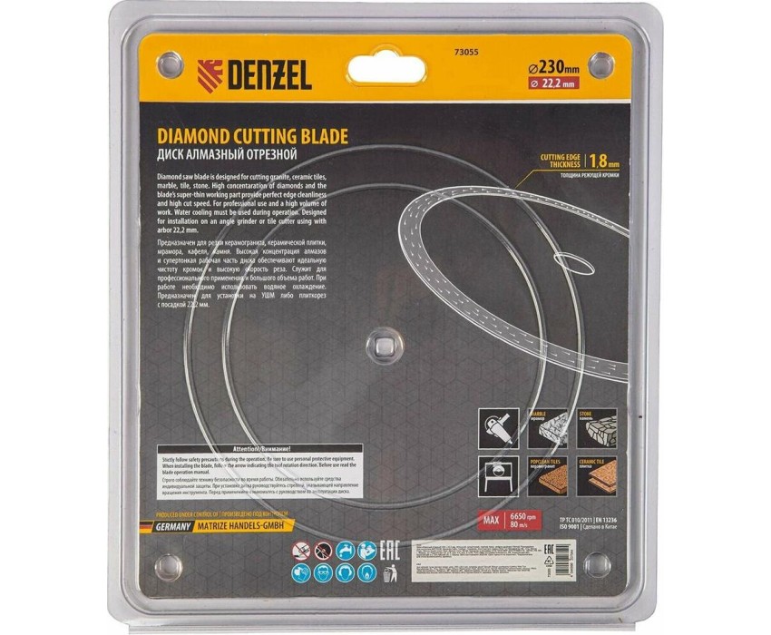 Алмазный диск ТМ Denzel "Сплошной" арт 73055, ф230 х 22,2 мм, предназначен для мокрого резания мрамора, керамогранита и керамическую плитки, камня. Устанавливается на УШМ (болгарку) или плиткорез с посадочным диаметром 22,2 мм. Высокая концентрация алмазов и супертонкая рабочая часть диска обеспечивает идеальную частоту кромок и высокую скорость реза.Диск произведен по технологии горячего прессования с увеличенной шириной режущей кромки (10мм) подходит для профессионального использования и больших объемов работ.