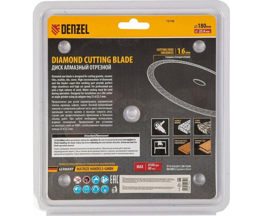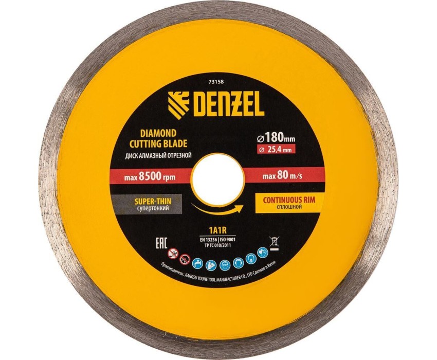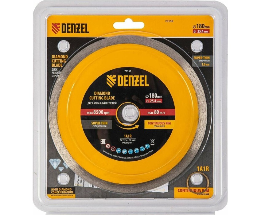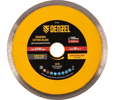 Алмазный диск DENZEL Диск алмазный сплошной, супертонкий, 180 х 25,4 мм, горячее прессование, мокрое резание 73158