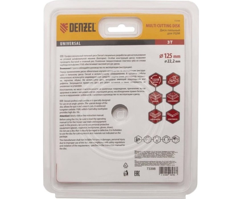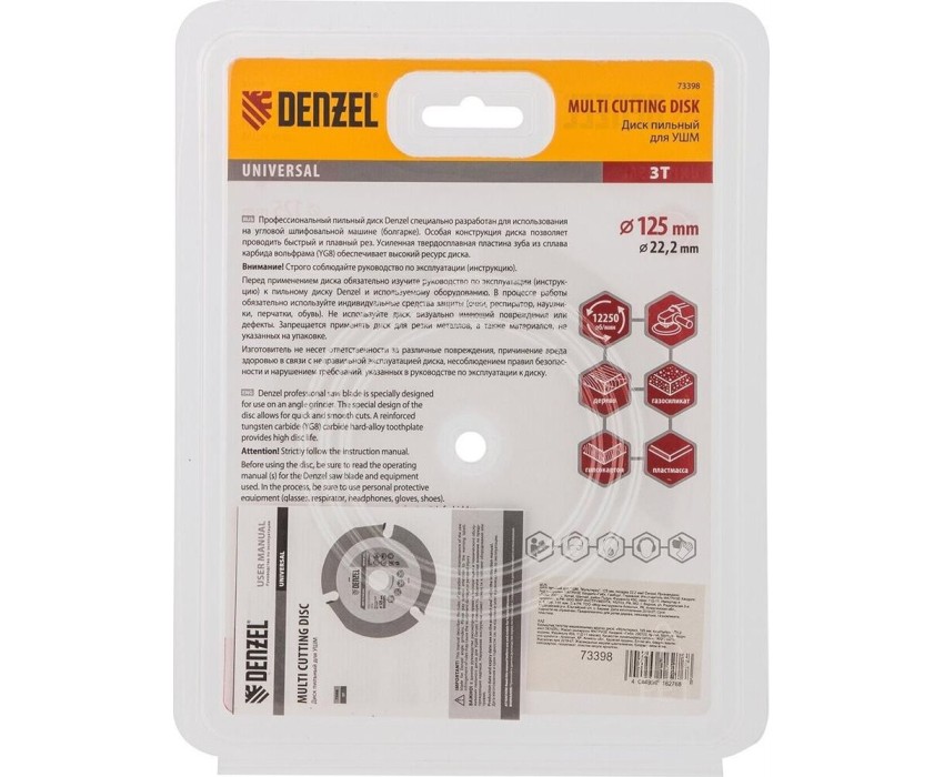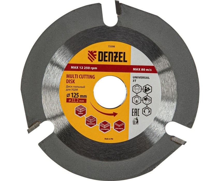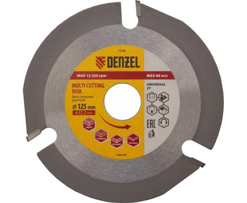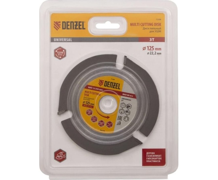 Пильный диск для УШМ Denzel Мультирез 73398, 125 х 22,2 мм, позволяет быстро распилить древесину, тонкий пластик, гипсокартон и газосиликат. Является оснасткой для углошлифовальных машин, что делает его универсальным. Будет полезен как профессиональным мастерам, так и домашним умельцам. Перед эксплуатацией необходимо изучить инструкцию как диска, так и углошлифовальной машины.ПреимуществаДиск имеет высокий рабочий ресурс благодаря усиленным режущим пластинам из высокотвердого сплава карбида вольфрама YG8.Особая форма режущих пластин позволяет делать поперечные выборки древесины и других материалов.За счет продуманной геометрии диск быстро и плавно режет материалы без рывков, обеспечивая высокое качество работ.Прочный корпус не деформируется даже при интенсивном использовании.