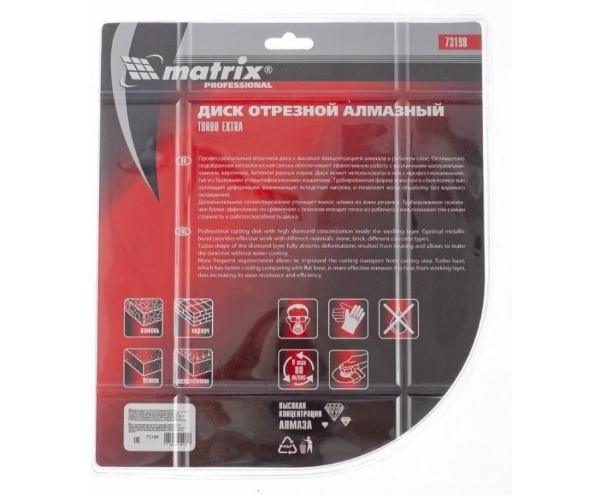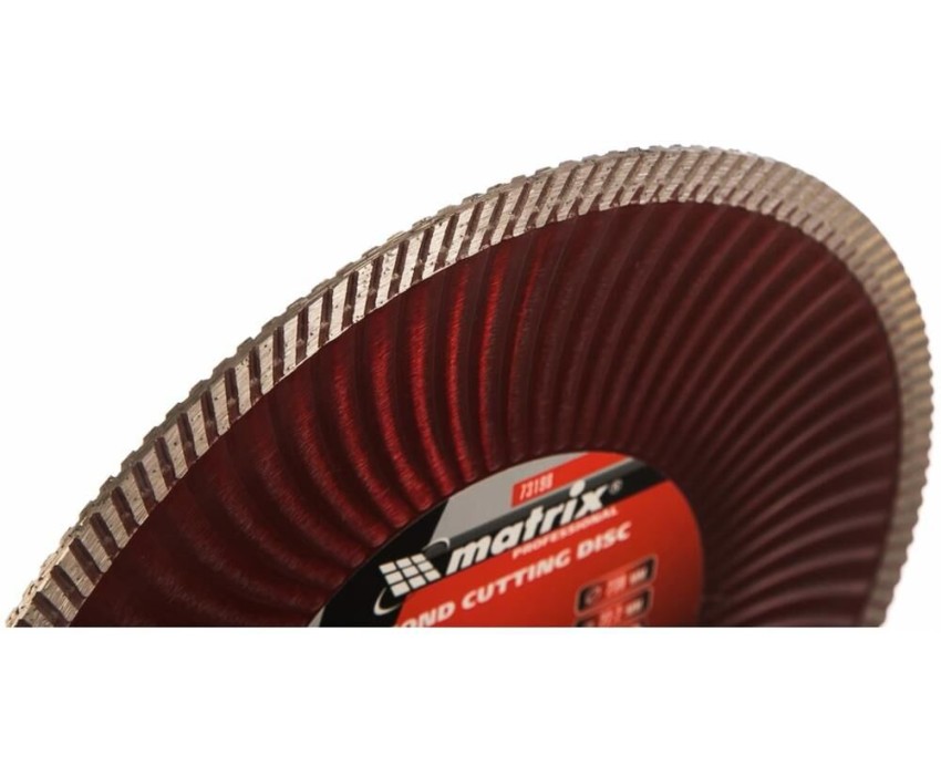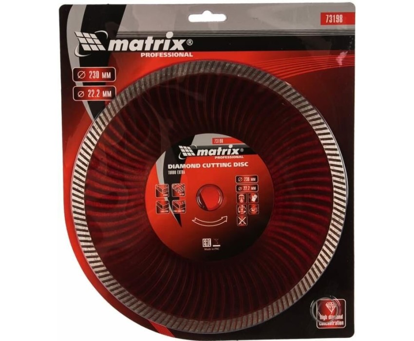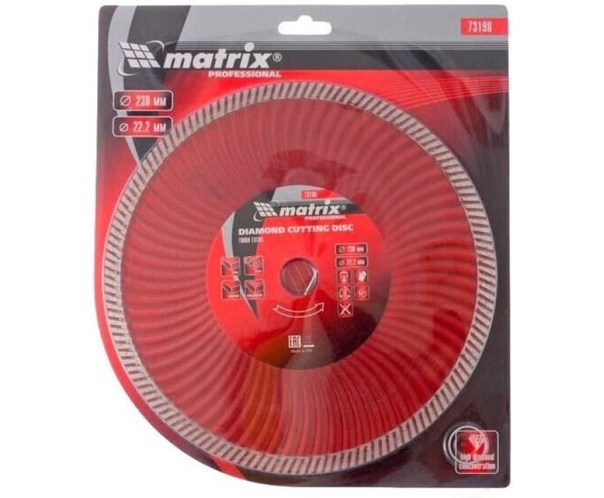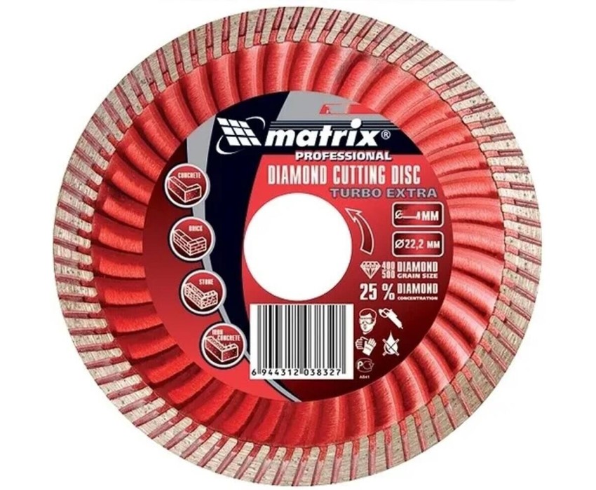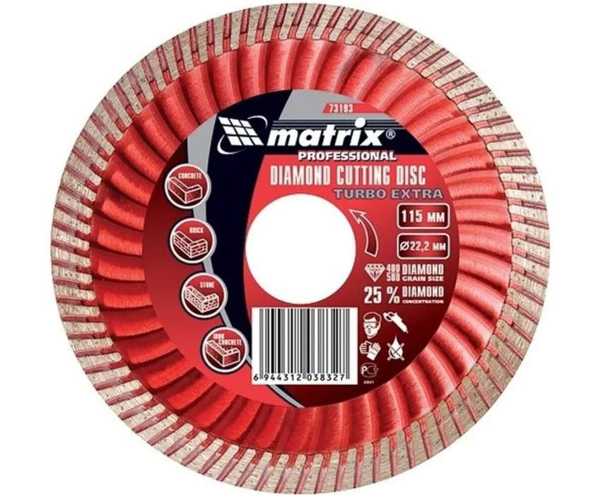 Отрезной алмазный диск Matrix Turbo Extra 73198, 230 х 22,2 мм, используется для сухой резки бетона, железобетона, кирпича, тротуарной плитки, шлакоблока и камня. Он устанавливается на углошлифовальные машины с посадочным диаметром 22,2 мм. Обеспечивает высокую скорость реза, поэтому подходит для интенсивного применения.ПреимуществаЭкстратурбированная форма - в процессе реза обеспечивается эффективное охлаждение и удаление шлама.Повышенная производительность - рабочий слой шириной 7 мм состоит из синтетических алмазов высокого качества.Оптимально сбалансированный состав связки - режущий слой равномерно стачивается, своевременно вскрывая новые алмазы.Эффективное решение бытовых и профессиональных задач - концентрация алмазов повышена, диск рассчитан на долгую эксплуатацию.