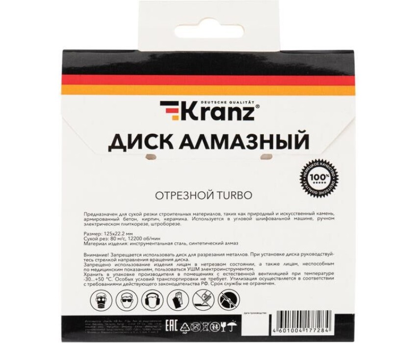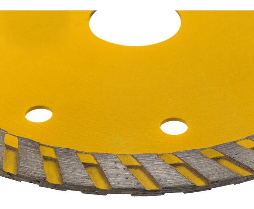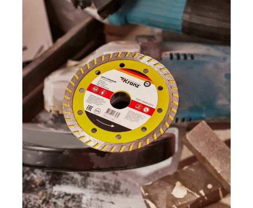 Отрезной алмазный диск Turbo используется для сухой резки строительных материалов, таких как кирпич, керамика, керамогранит, природный и искусственный камень, армированный и неармированный бетон. Применяется совместно с в угловыми шлифовальными машинами, ручными электрическими плиткорезами, штроборезами. Диск состоит из стального корпуса и алмазного рабочего слоя, с высотой кромки 10 мм, что обеспечивает эффективную резку материала и долгий срок службы самого диска. Наличие специальных прорезей на ободе увеличивает скорость резки, повышает воздушное охлаждение, способствует отводу пыли, а также позволяет работать с диском без водяного охлаждения. Срок годности не ограничен. Хранить в сухом прохладном месте. Использовать строго по назначению. Внимание! Запрещается использовать диск для разрезания металлов. При установке диска руководствуйтесь стрелкой направления вращения диска. Используйте средства индивидуальной защиты. Не утилизируйте с бытовыми отходами.