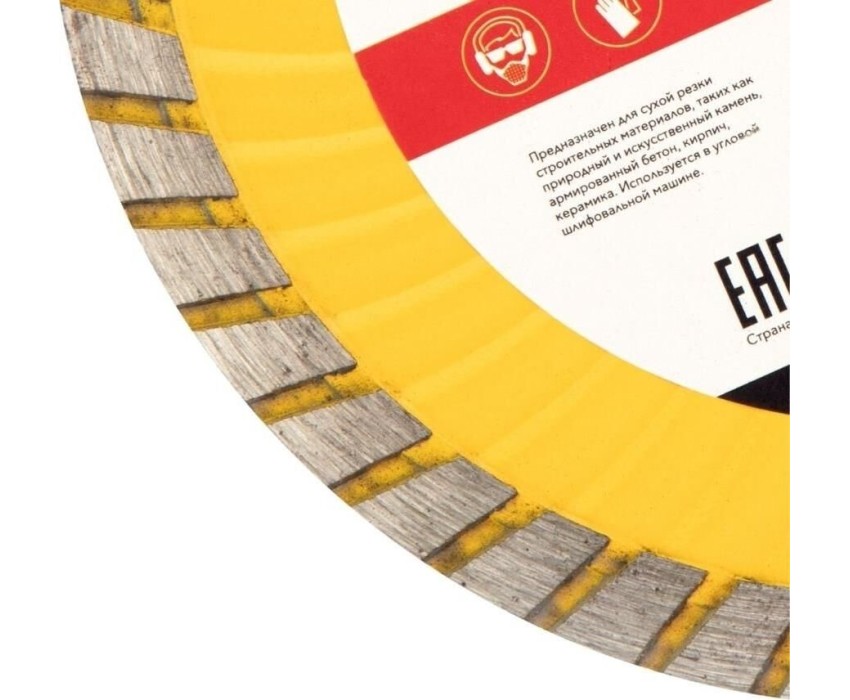 Диск алмазный отрезной Turbo волна применяется для сухой и влажной резки строительных материалов, таких как природный и искусственный камень, армированный и неармированный бетон, кирпич, керамика и керамогранит. Диск состоит из стального корпуса и алмазного рабочего слоя с высотой кромки 10 мм, что обеспечивает эффективную резку материала и долгий срок службы самого диска. Процесс резки сопровождается воздушным охлаждением за счет турбированной формы алмазного слоя. Это позволяет пилить без водяного охлаждения. Срок годности не ограничен. Хранить в сухом прохладном месте. Использовать строго по назначению. Внимание! Запрещается использовать диск для разрезания металлов. При установке диска руководствуйтесь стрелкой направления вращения диска. Используйте средства индивидуальной защиты. Не утилизируйте с бытовыми отходами.