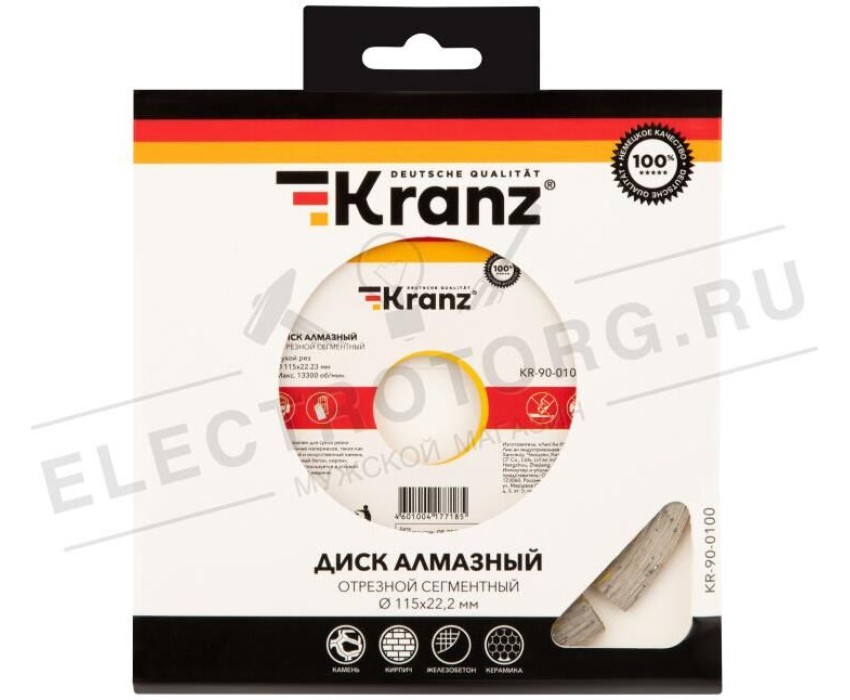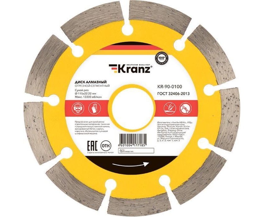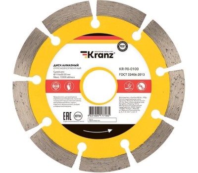 Диск алмазный KRANZ (KR-90-0100) Диск алмазный отрезной сегментный 115x22,2x2x10мм