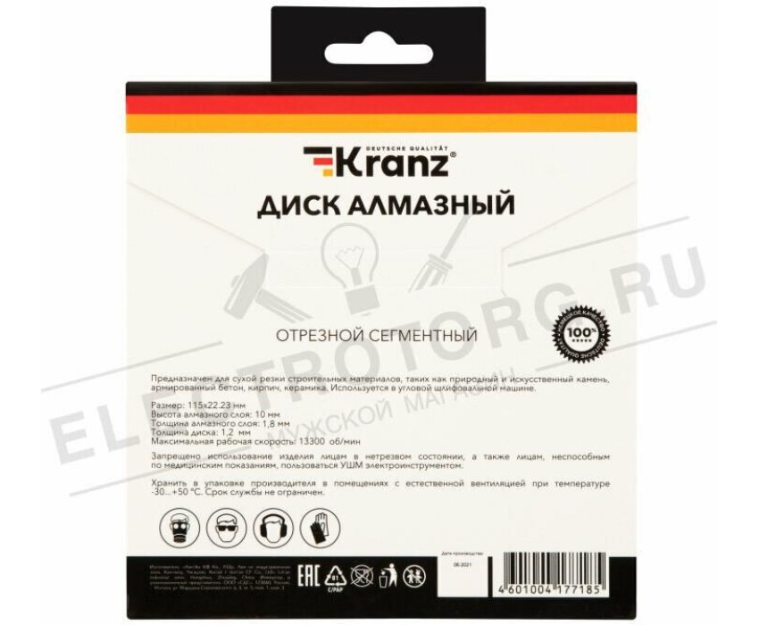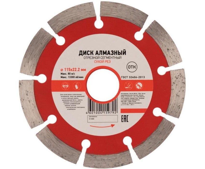 Сегментный алмазный отрезной диск предназначен для сухой резки строительных материалов, таких как природный и искусственный камень, армированный и неармированный бетон, кирпич, керамика, керамогранит. Используется в угловых шлифовальных машинах, ручных электрических плиткорезах, а также в штроборезах. Диск состоит из стального корпуса и алмазных сегментов, с высотой рабочей кромки 10 мм, что обеспечивает эффективную резку материала и долгий срок службы самого диска. Благодаря сегментированной форме диска достигается наиболее быстрый рез. Процесс резки сопровождается воздушным охлаждением. Срок годности не ограничен. Хранить в сухом прохладном месте. Использовать строго по назначению. Внимание! Запрещается использовать диск для резки металлов. При установке диска руководствуйтесь стрелкой направления вращения диска. Используйте средства индивидуальной защиты. Не утилизируйте с бытовыми отходами.