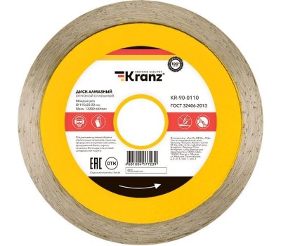 Диск алмазный KRANZ (KR-90-0110) Диск алмазный отрезной сплошной 115x22,2x1,8x10мм