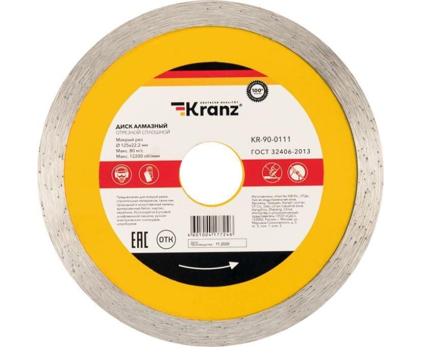 Сплошной алмазный отрезной диск предназначен для мокрой резки строительных материалов, таких как кирпич, керамика, керамогранит, природный и искусственный камень, армированный и неармированный бетон. Применяется совместно с в угловыми шлифовальными машинами, ручными электрическими плиткорезами, штроборезами. Диск состоит из стального корпуса и алмазного рабочего слоя с высотой кромки 10 мм, что обеспечивает эффективную резку материала и долгий срок службы самого диска. Сплошная конструкция способствует равномерному распределению нагрузки на кромке диска, а также создает более аккуратный рез. Процесс резки необходимо сопровождать водяным охлаждением. Срок годности не ограничен. Хранить в сухом прохладном месте. Использовать строго по назначению. Внимание! Запрещается использовать диск для разрезания металлов. При установке диска руководствуйтесь стрелкой направления вращения диска. Используйте средства индивидуальной защиты. Не утилизируйте с бытовыми отходами.