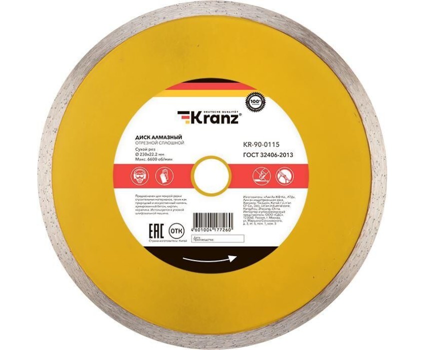 Диск алмазный KRANZ (KR-90-0115) Диск алмазный отрезной сплошной 230x22,2x2,4x10мм