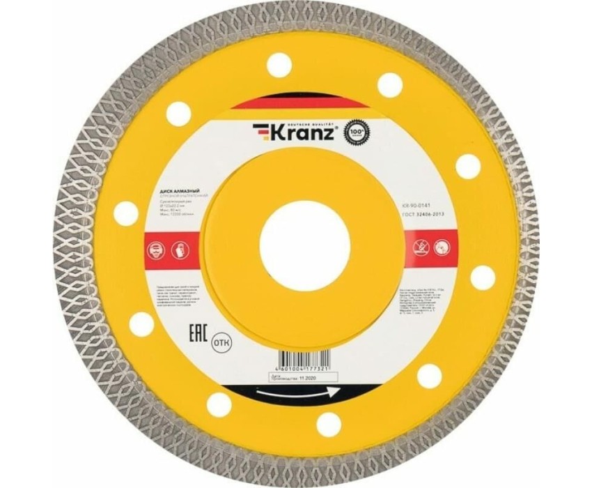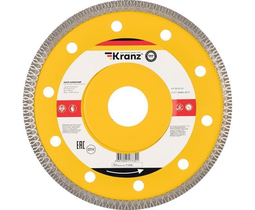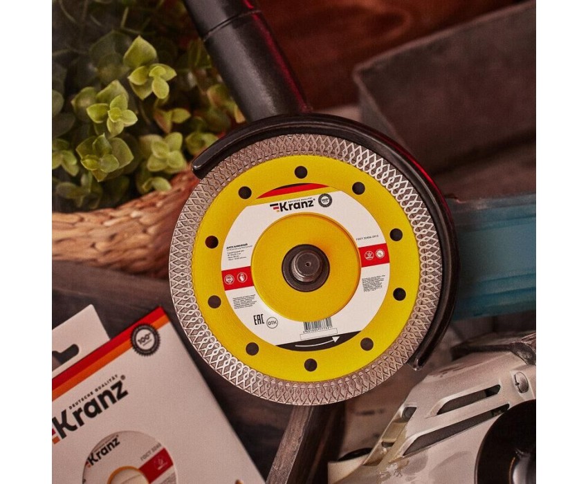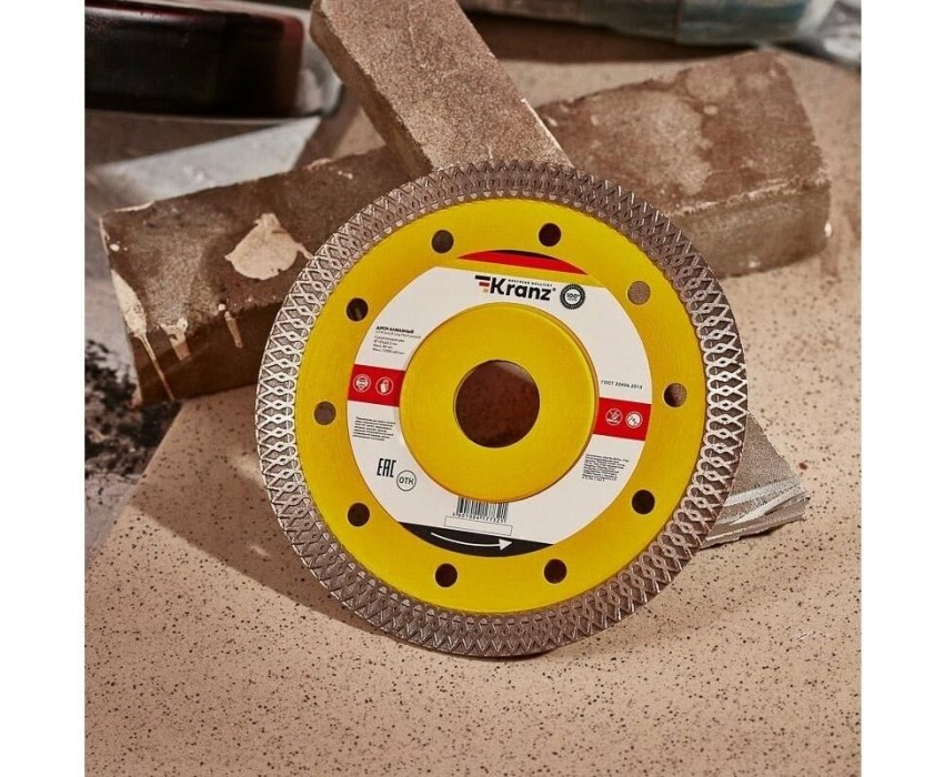Диск алмазный отрезной ультратонкий предназначен для использования с угловыми шлифовальными машинами (УШМ) и ручными электрическими плиткорезами. Применяется для сухой и мокрой резки строительных материалов, таких как гранит, керамогранит, песчаник, клинкер, мрамор, керамика. Диск изготовлен из инструментальной стали и обладает ультратонким лезвием, покрытым синтетическим алмазом с высотой кромки 10 мм, что обеспечивает точную и чистую резку и долгий срок службы самого диска. Процесс резки сопровождается воздушным охлаждением за счет особой формы алмазного слоя. Это позволяет пилить без водяного охлаждения. Срок годности не ограничен. Хранить в сухом прохладном месте. Использовать строго по назначению. Внимание! Запрещается использовать диск для разрезания металлов. При установке диска руководствуйтесь стрелкой направления вращения диска. Используйте средства индивидуальной защиты. Не утилизируйте с бытовыми отходами.