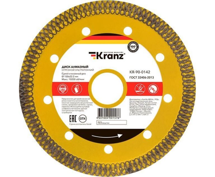 Диск алмазный KRANZ (KR-90-0142) Диск алмазный отрезной ультратонкий 150x22,2x1,6x10 мм