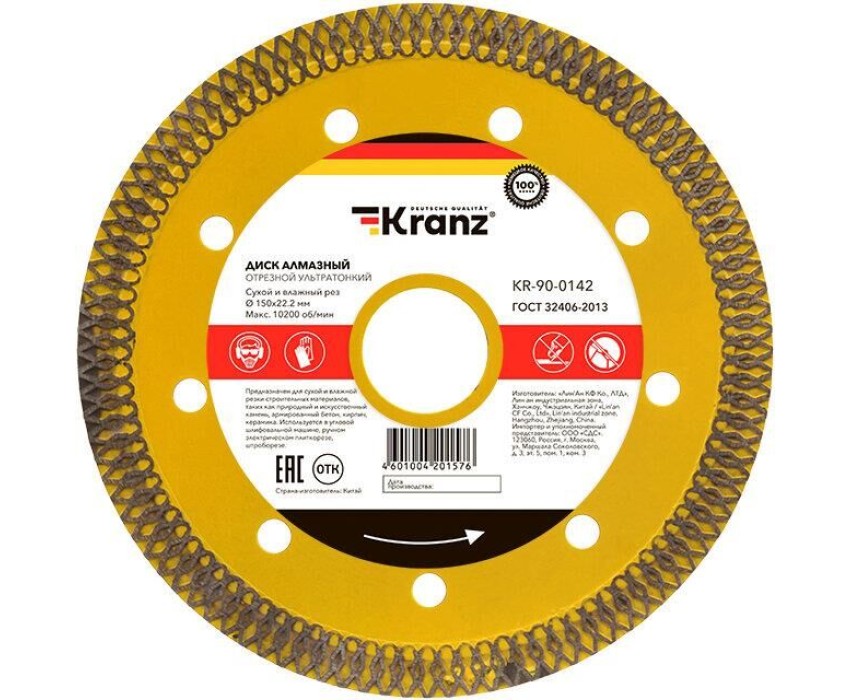 Диск алмазный отрезной ультратонкий предназначен для использования с угловыми шлифовальными машинами (УШМ) и ручными электрическими плиткорезами. Применяется для сухой и мокрой резки строительных материалов, таких как гранит, керамогранит, песчаник, клинкер, мрамор, керамика. Диск изготовлен из инструментальной стали и обладает ультратонким лезвием, покрытым синтетическим алмазом с высотой кромки 10 мм, что обеспечивает точную и чистую резку и долгий срок службы самого диска. Процесс резки сопровождается воздушным охлаждением за счет особой формы алмазного слоя. Это позволяет пилить без водяного охлаждения. Срок годности не ограничен. Хранить в сухом прохладном месте. Использовать строго по назначению. Внимание! Запрещается использовать диск для разрезания металлов. При установке диска руководствуйтесь стрелкой направления вращения диска. Используйте средства индивидуальной защиты. Не утилизируйте с бытовыми отходами.