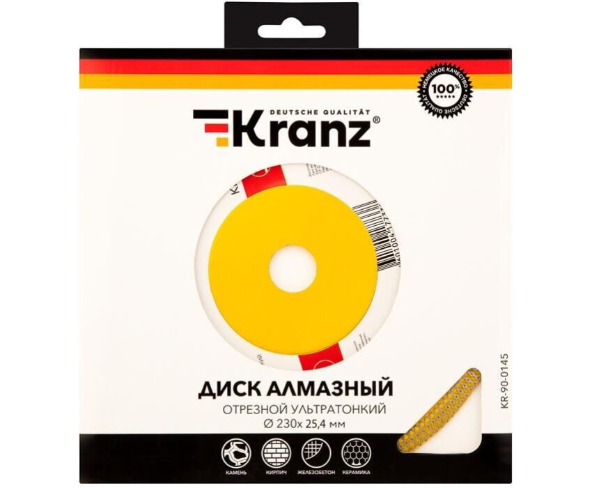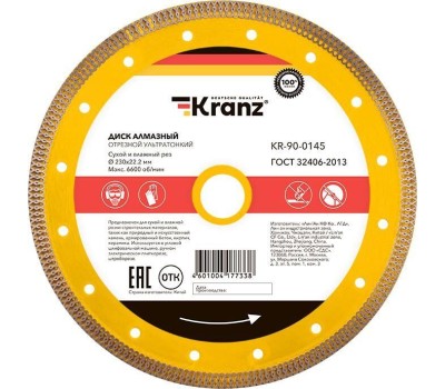 Диск алмазный KRANZ (KR-90-0145) Диск алмазный отрезной ультратонкий 230x25,4/22,2x2x10 мм