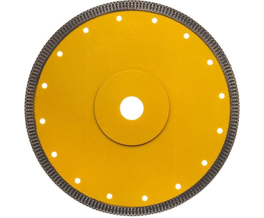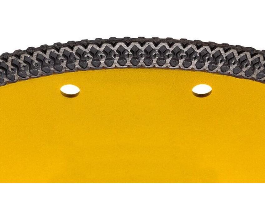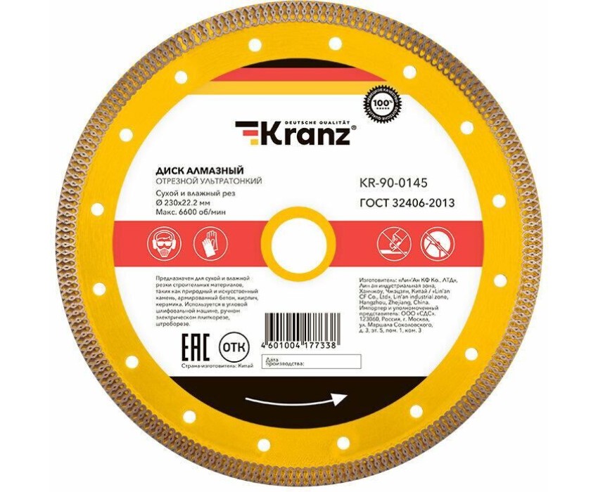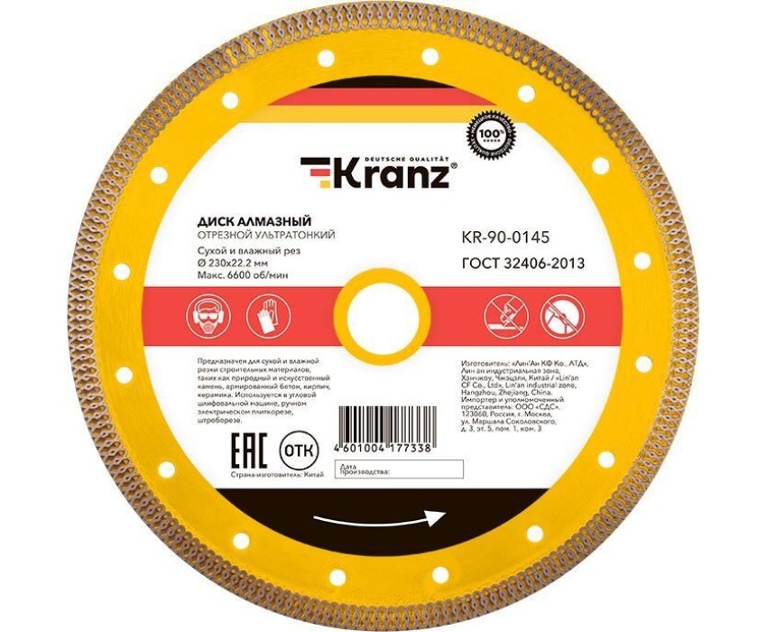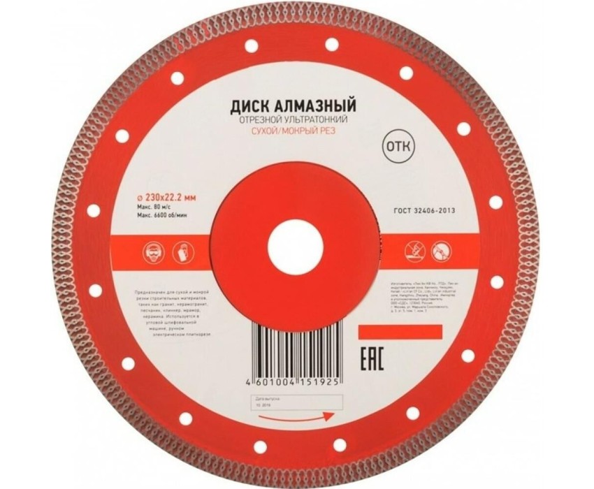 Диск алмазный отрезной ультратонкий предназначен для использования с угловыми шлифовальными машинами (УШМ) и ручными электрическими плиткорезами. Применяется для сухой и мокрой резки строительных материалов, таких как гранит, керамогранит, песчаник, клинкер, мрамор, керамика. Диск изготовлен из инструментальной стали и обладает ультратонким лезвием, покрытым синтетическим алмазом с высотой кромки 10 мм, что обеспечивает точную и чистую резку и долгий срок службы самого диска. Процесс резки сопровождается воздушным охлаждением за счет особой формы алмазного слоя. Это позволяет пилить без водяного охлаждения. Срок годности не ограничен. Хранить в сухом прохладном месте. Использовать строго по назначению. Внимание! Запрещается использовать диск для разрезания металлов. При установке диска руководствуйтесь стрелкой направления вращения диска. Используйте средства индивидуальной защиты. Не утилизируйте с бытовыми отходами.