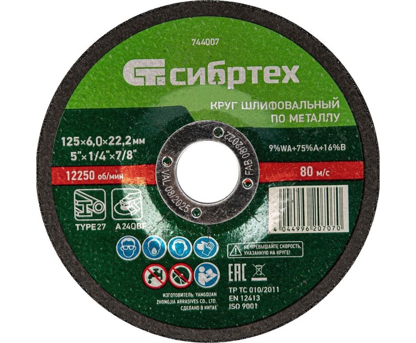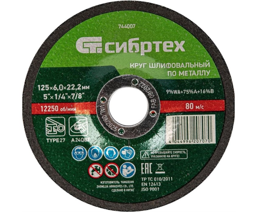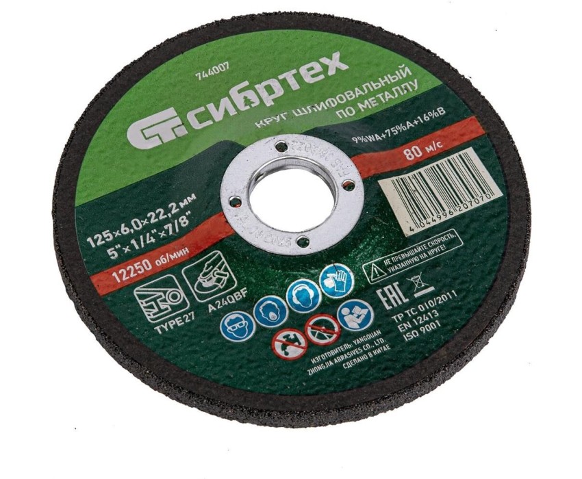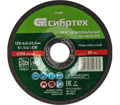 СИБРТЕХ Круг шлифовальный по металлу, 125 х 6 х 22.2 мм, 9%WA+75%A+16%B,