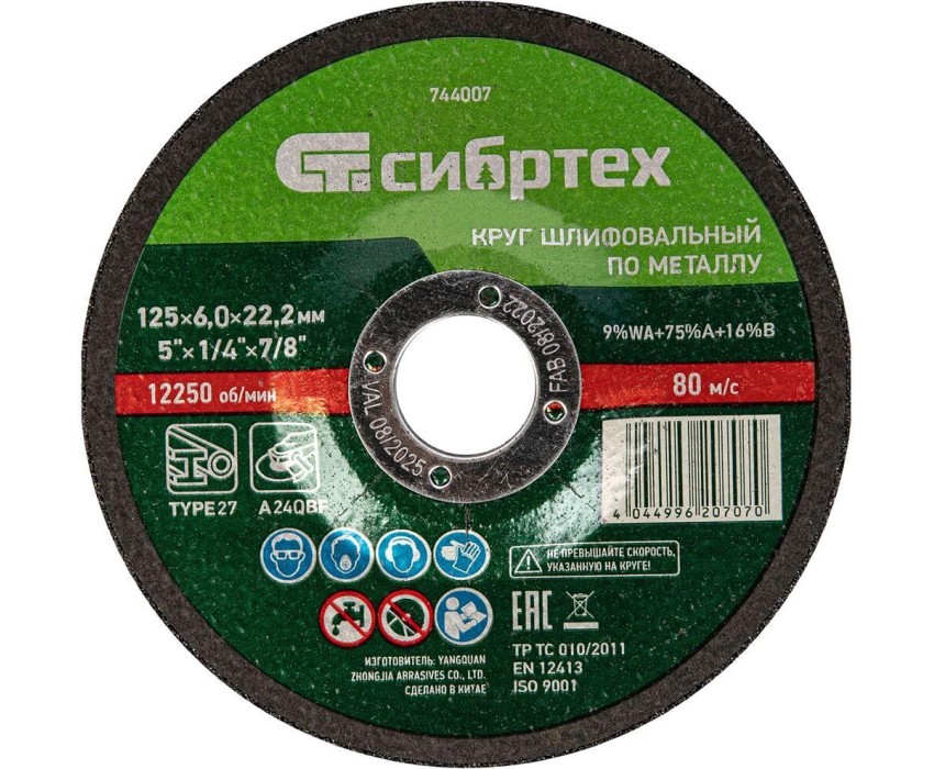 Шлифовальный круг по металлу Сибртех 744007, 125 х 6,0 х 22,2 мм, предназначен для установки на фланец углошлифовальных машин, совместимых с оснасткой диаметром 125 мм. Используется для сухой обработки металлических поверхностей. Абразив с зернистостью F24 удаляет ржавчину, заусенцы, окалину, применяется для зачистки сварных швов. Профиль круга с утопленным центром более оптимален для зачистных работ с УШМ.ПреимуществаАбразивным материалом являются частицы твердого оксида алюминия, поэтому круг обладает высокой шлифующей способностью.Конструкция круга имеет прочную и износостойкую структуру благодаря 3-слойной стеклосетке, бакелитовой связке надежно удерживающей абразив.Толщина круга составляет 6 мм, поэтому он прослужит долго.Максимально допустимая скорость вращения составляет 13300 об/мин, это обеспечивает высокую производительность работ.