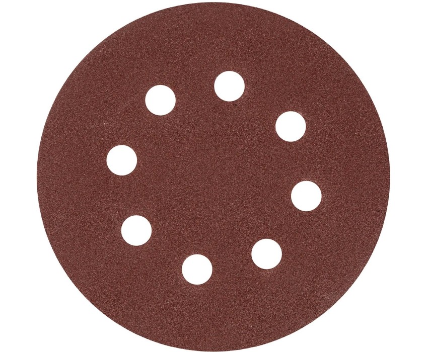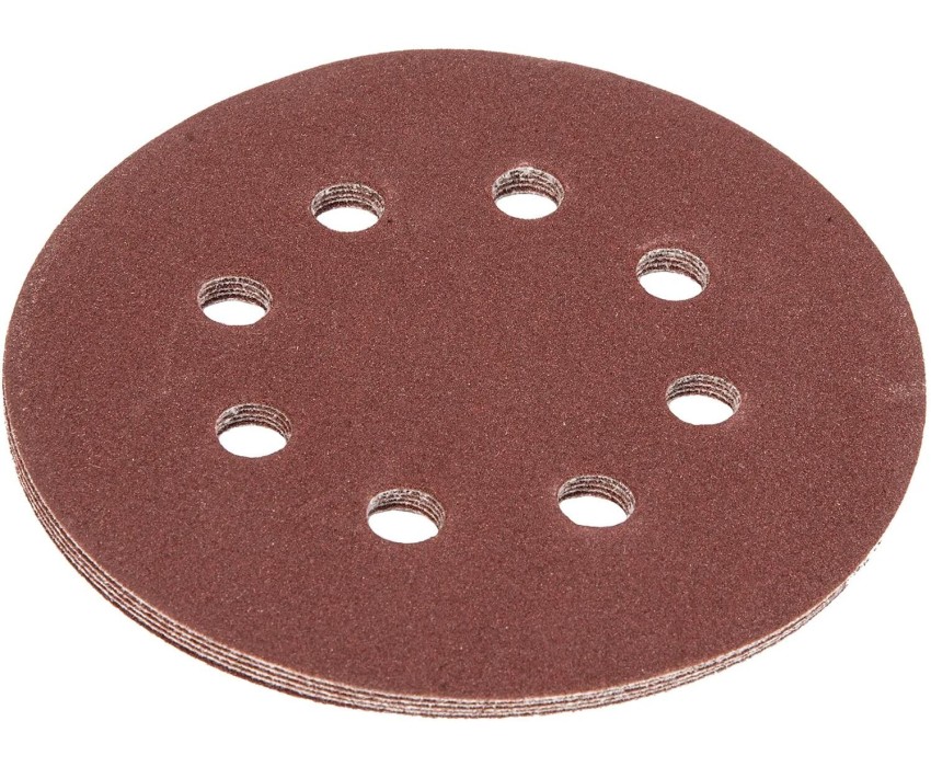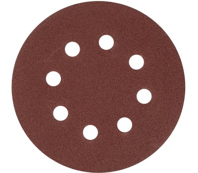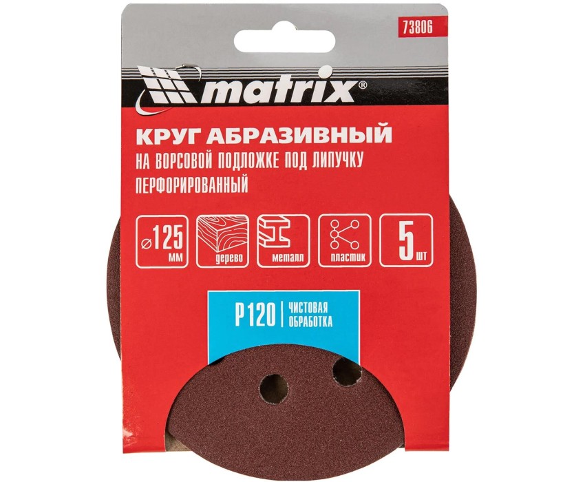 Перфорированный абразивный круг Matrix 73806 диаметром 125 мм, со среднезернистым абразивом P 120, на ворсовой подложке под «липучку», 5 шт. в упаковке, используется для сухого чистового шлифования металла, древесины, пластика и других материалов.