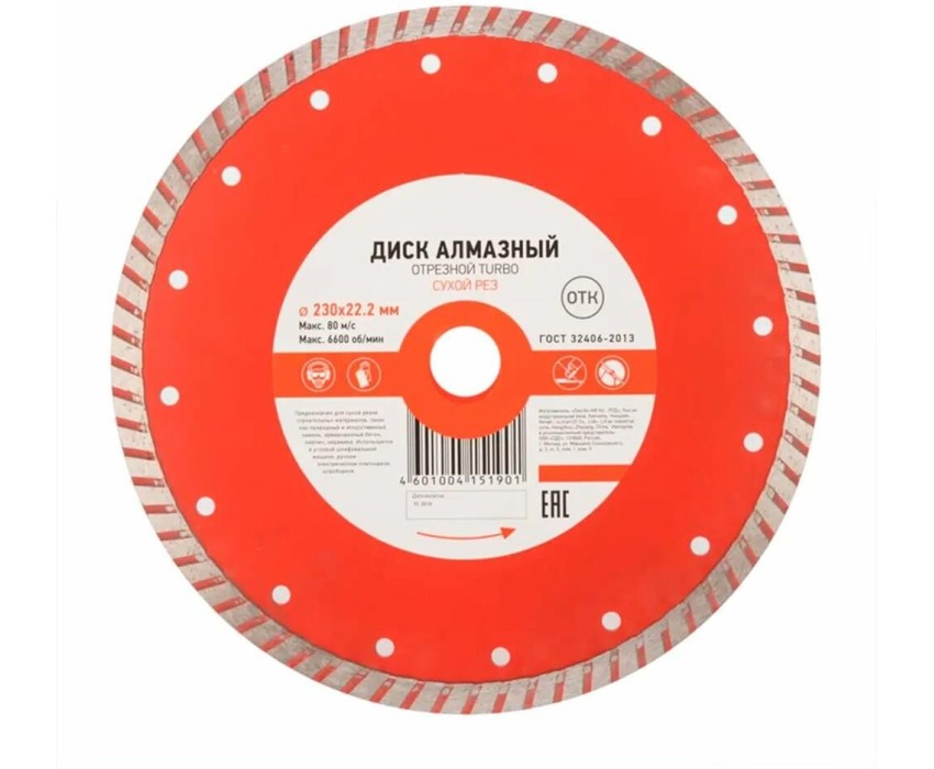 Диск алмазный отрезной Turbo 230x22.2 мм REXANT предназначен для сухой резки строительных материалов, таких как природный и искусственный камень, армированный бетон, кирпич, керамика. Используется в угловой шлифовальной машине, ручном электрическом плиткорезе, штроборезе.