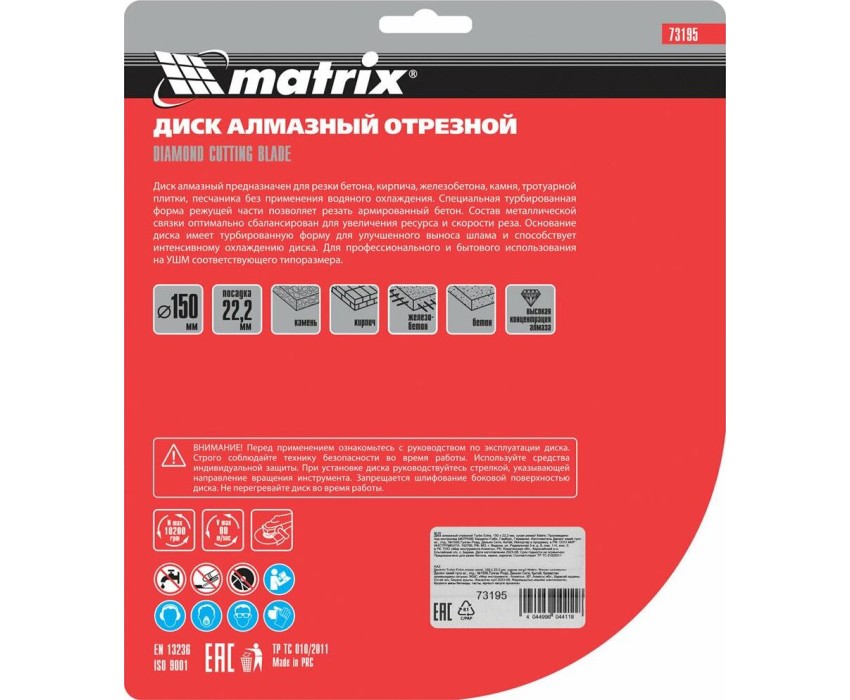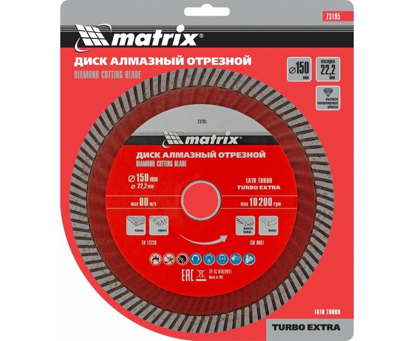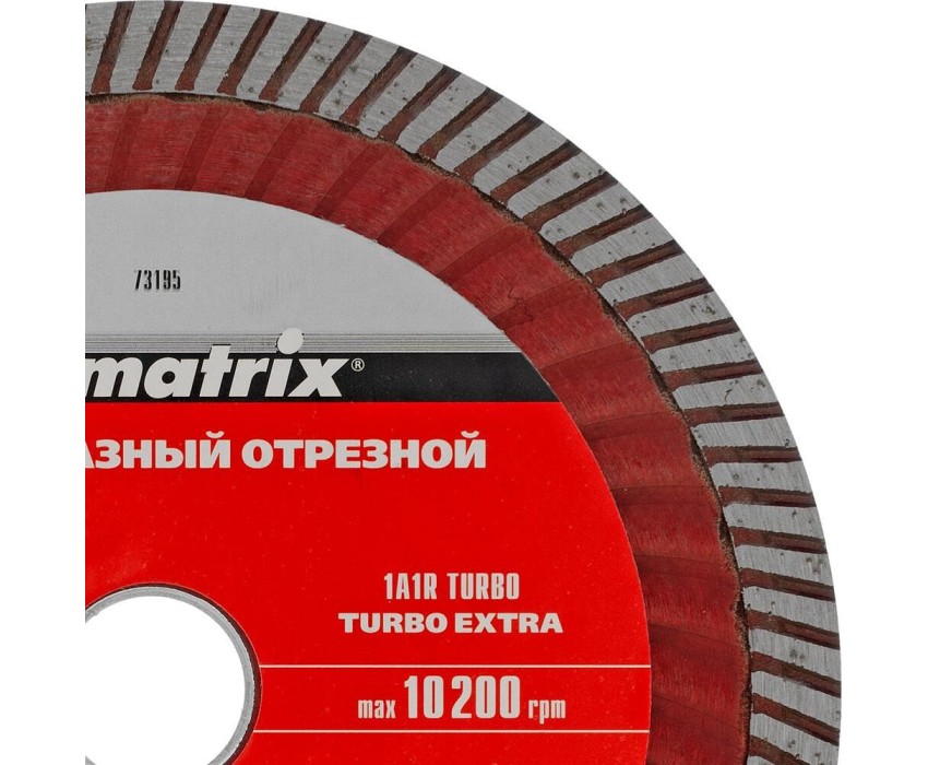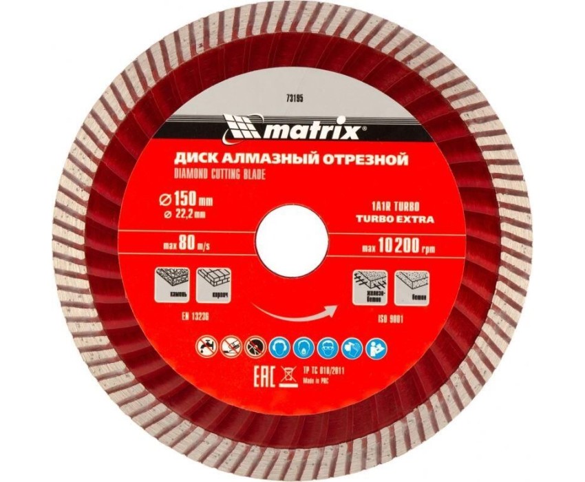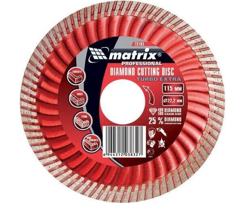 Отрезной алмазный диск Matrix Turbo Extra 73195, 150 х 22,2 мм, используется для сухой резки бетона, железобетона, кирпича, тротуарной плитки, шлакоблока и камня. Он устанавливается на углошлифовальные машины с посадочным диаметром 22,2 мм. Обеспечивает высокую скорость реза, поэтому подходит для интенсивного применения.ПреимуществаЭкстратурбированная форма - в процессе реза обеспечивается эффективное охлаждение и удаление шлама.Повышенная производительность - рабочий слой шириной 7 мм состоит из синтетических алмазов высокого качества.Оптимально сбалансированный состав связки - режущий слой равномерно стачивается, своевременно вскрывая новые алмазы.Эффективное решение бытовых и профессиональных задач - концентрация алмазов повышена, диск рассчитан на долгую эксплуатацию.