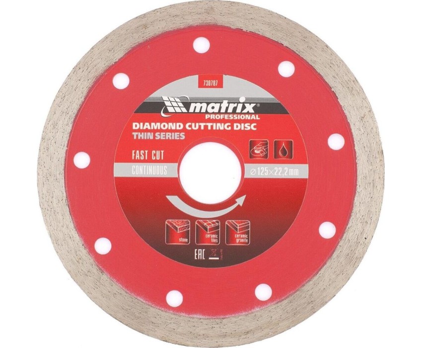 Отрезной сплошной алмазный диск Matrix ф125х22,2 мм 730787, тонкий, обеспечивает мокрое резание плотных материалов: керамогранита, керамической и кафельной плитки, мрамора, натурального и искусственного камня. Он устанавливается на УШМ или плиткорезы и используется с применением водяного охлаждения. Диск увеличивает производительность на 20% благодаря небольшой толщине 1,5 мм и снижению нагрузки на инструмент.ПреимуществаСплошная форма и перфорированный корпус позволяют добиться высокого качества реза и предотвращают появление сколов.Режущая часть шириной 10 мм с высокой концентрацией алмазов способствуют увеличению рабочего ресурса диска на 50%.Высокий ресурс и износостойкость рабочей части достигается за счет металлической связки.Метод ускоренного горячего прессования улучшает сопротивление режущей части нагрузкам и делает мокрое резание более качественным.Диск может использоваться в бытовых целях и профессионально.