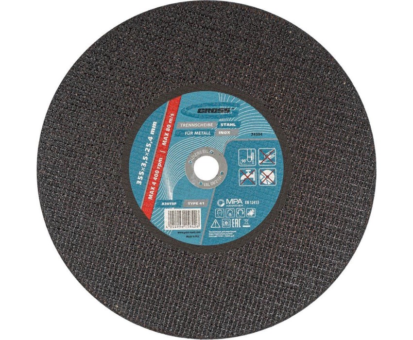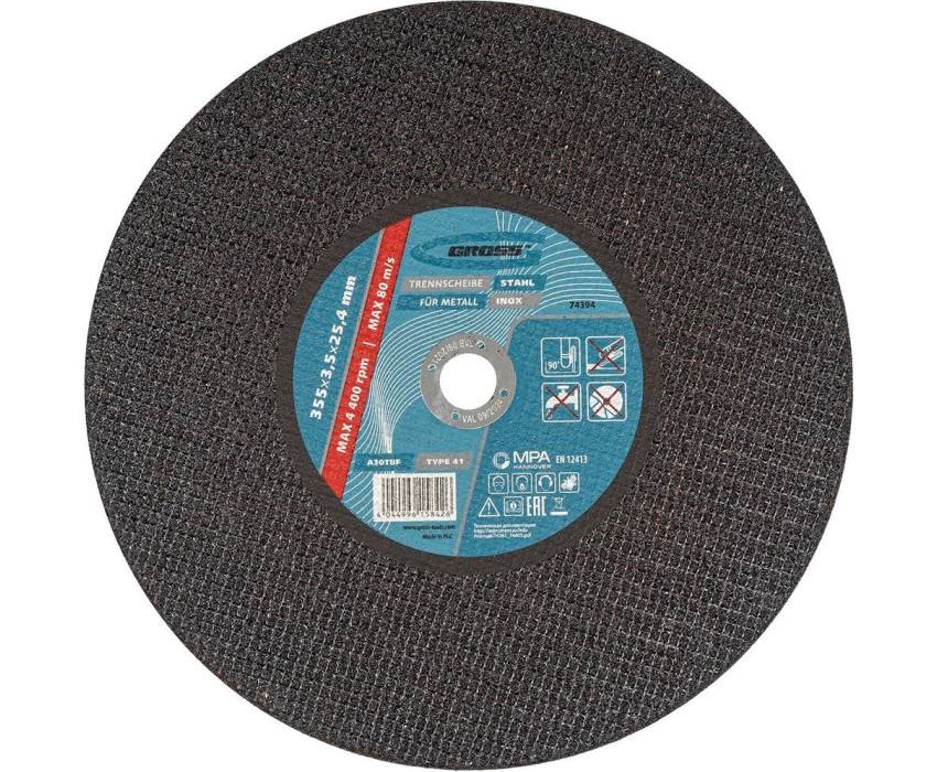 Отрезной круг по металлу Gross WA24TBF 74394, 355 х 3,5 х 25,4 мм, рассчитан на интенсивный сухой рез нержавеющих легированных и углеродистых сталей. Устанавливается на УШМ соответствующего типоразмера. Надежный и производительный, круг подходит для профессиональной эксплуатации с высокими нагрузками.ПреимуществаАбразив из монокорунда с добавками - зерно обладает высокой твердостью и прочностью, подтачивается в процессе работы, поэтому эффективность реза не снижается.Очень высокий ресурс - в бакелитовую связку и абразив включены специальные добавки.Безопасность работы - высококачественная двухслойная стеклосетка защищает круг от перегрузок, предотвращая его разлет в случае зажатия в материале.Специальный состав - круг слабо нагревается в процессе реза, износ происходит медленно и равномерно, поэтому образуется минимальное количество пыли и искр.Толщина 3,5 мм и крупный абразив F24 - износостойкий круг легко выдерживает интенсивное использование.Плотная равномерная структура - круг прошел дополнительное тестирование на дисбаланс, это обеспечивает стабильность и точность работы.Проверенное качество - круг прошел контроль на всех этапах производства, что подтверждено ганноверским и российским сертификатами безопасности.