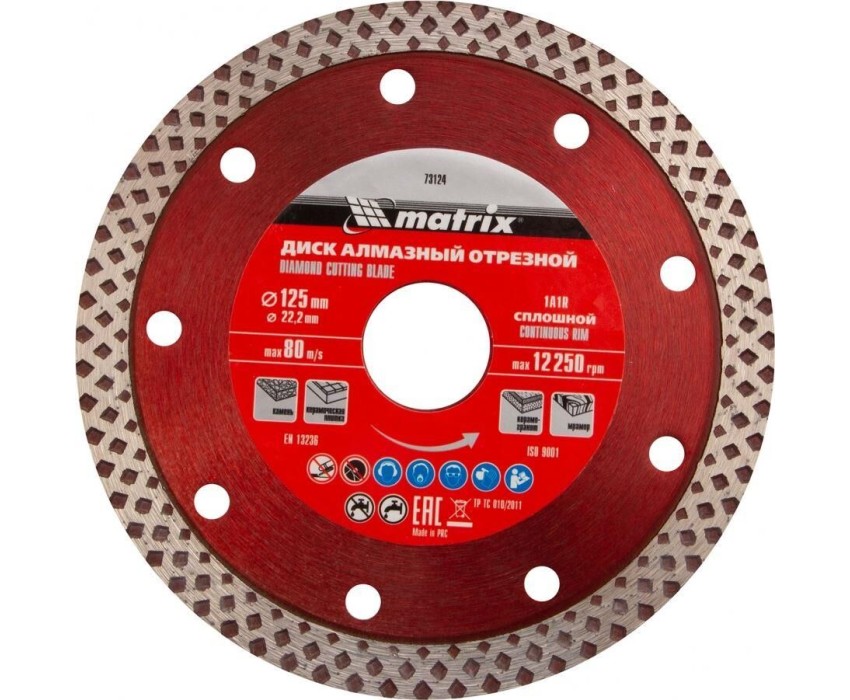 Отрезной алмазный диск Matrix 73124, сплошной, 125 мм - оснастка для болгарок и плиткорезов с диаметром вала 22,2 мм. Он применяется для резки мрамора, искусственного и натурального камня, керамогранитной и керамической плитки. Использование без подачи воды расширяет возможности инструмента. Диск предназначен для бытового применения. Рекомендуется использовать водяное охлаждение для увеличения ресурса диска.ПреимуществаБлагодаря высокой концентрации алмазов срез получается чистым и ровным.Режущая кромка шириной 10 мм способствует повышению производительности.Отверстия в корпусе диска способствуют активному охлаждению, что позволяет использовать диск для сухой резки.Диск выполнен нанесен методом холодного прессования, поэтому устойчив к механическим нагрузкам.