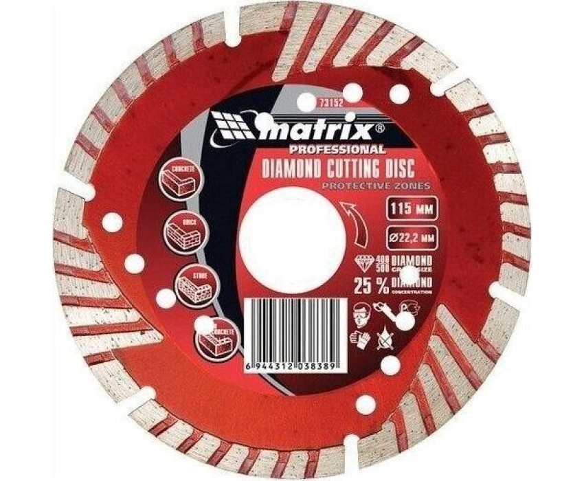 Диск алмазный отрезной сегментный Matrix 73155 с защитными секторами, 180 х 22,2 мм, применяется для сухой резки бетона разной прочности, камня, кирпича, шлакоблока и тротуарной плитки. Он используется как оснастка для углошлифовальных машин с соответствующим посадочным диаметром. Диск изготовлен методом холодного прессования и выдерживает повышенные нагрузки при прохождении арматуры в слабоармированном железобетоне.ПреимуществаСегментная структура рабочей части обеспечивает эффективное охлаждение и отвод пыли, поэтому подача воды не требуется.Защитные секторы предохраняют сегменты диска от преждевременного износа и от налипания шлама.За счет уникальной формы диск позволяет выполнять кратковременную обработку боковой поверхностью без риска поломки.Увеличенная концентрация алмазов и специально подобранная металлическая связка обеспечивают высокий ресурс диска.Благодаря ширине рабочей части 7 мм диск успешно справляется с бытовыми задачами.