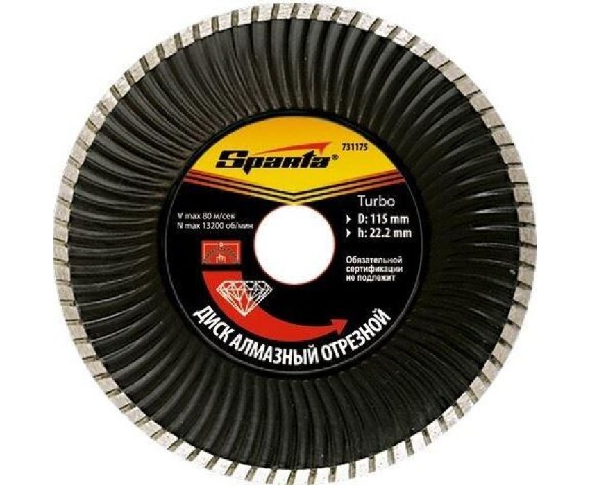 Алмазный отрезной диск Sparta Turbo 731235 для сухой резки, 180 х 22,2 мм, устанавливается на углошлифовальные машинки и предназначен для использования в быту. Он позволяет резать твердые материалы - бетон, железобетон, камень, песчаник.ПреимуществаТурбированная рабочая часть эффективно отводит тепло и шлам, поэтому диск можно использовать для быстрой сухой резки без водяного охлаждения.Диск изготовлен методом холодного прессования, за счет чего успешно противостоит высоким нагрузкам.Алмазный слой шириной 6 мм обеспечивает хорошее качество реза.