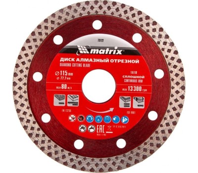 Диск алмазный MATRIX Диск алмазный, отрезной сплошной, 115 х 22.2 мм, сухая резка Professional 73122