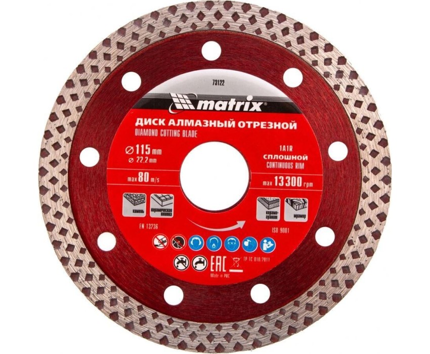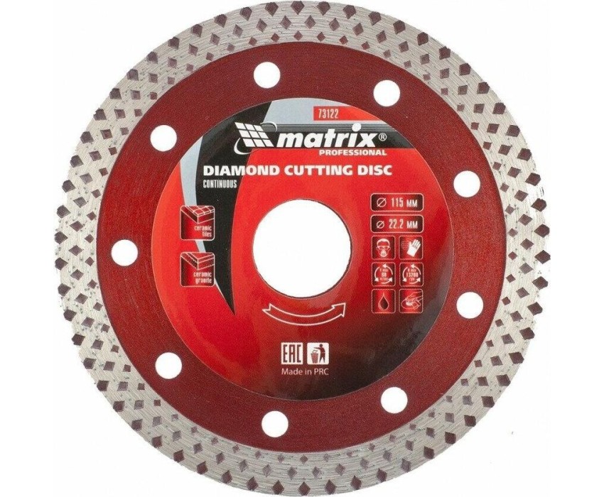 Отрезной алмазный диск Matrix 73122, сплошной, 115 мм - оснастка для болгарок и плиткорезов с диаметром вала 22,2 мм. Он применяется для резки мрамора, искусственного и натурального камня, керамогранитной и керамической плитки. Использование без подачи воды расширяет возможности инструмента. Диск предназначен для бытового применения. Рекомендуется использовать водяное охлаждение для увеличения ресурса диска.ПреимуществаБлагодаря высокой концентрации алмазов срез получается чистым и ровным.Режущая кромка шириной 10 мм способствует повышению производительности.Отверстия в корпусе диска способствуют активному охлаждению, что позволяет использовать диск для сухой резки.Диск выполнен нанесен методом холодного прессования, поэтому устойчив к механическим нагрузкам.