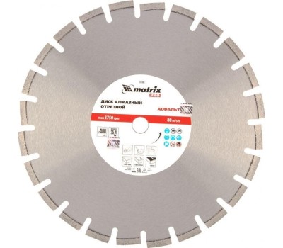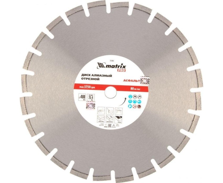 Диск алмазный Matrix PRO «Асфальт» 731083, ф400 х 25,4 мм, используется для сухого и мокрого реза асфальта, свежего бетона, асфальтобетона, камня, кирпича, абразивных материалов. Он применяется в качестве оснастки для ручных бензорезов или швонарезчиков с посадочным местом 25,4 мм. Диск устойчив к деформациям и выдерживает значительные нагрузки, поэтому имеет высокий рабочий ресурс. Мокрое резание рекомендуется проводить для увеличения ресурса диска.ПреимуществаСегментное строение - в процессе реза обеспечивается отвод тепла и шлама, что повышает производительность диска.Износостойкость - конструкцией круга предусмотрены защитные секторы, предохраняющие сегменты от истирания в месте крепления к корпусу и от налипания асфальтовой крошки на рабочую кромку.Ширина рабочей части 10 мм - производительность остается на стабильно высоком уровне независимо от типа материала (указанного на упаковке).Режущая часть закреплена методом лазерной приварки - алмазы надежно удерживаются на диске.