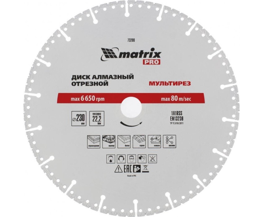 Алмазный отрезной диск Matrix PRO Мультирез 73200, 230 х 22,2 мм, применяется для сухого и мокрого резания бетона любой твердости, железобетона, гранита, кирпича, металла, древесины, пластика и других материалов. Используется в качестве универсального режущего инструмента в профессиональной сфере, например, строительными, специальными службами, сотрудниками МЧС. К работе с диском необходимо приступать после ознакомления с руководством пользователя.ПреимуществаНовейшая технология вакуумной пайки обеспечивает максимальную эффективность при работе с материалами любой твердости.Плотность алмазного порошка и оптимально сбалансированный состав связки обеспечивают износостойкость и высокую производительность диска.Благодаря сегментированной рабочей части и дополнительным отверстиям на корпусе диск активно охлаждается в процессе работы и не требует обязательной подачи воды.Диск обладает повышенной стойкостью к износу, поэтому его диаметр остается неизменным независимо от длительности эксплуатации.