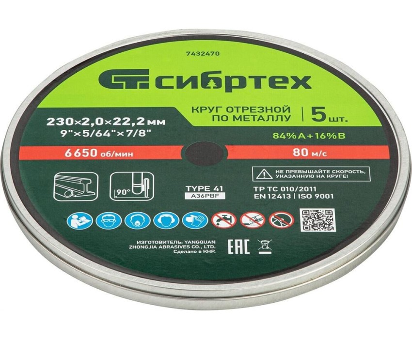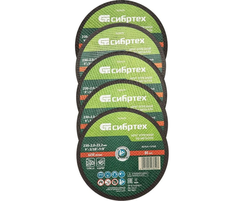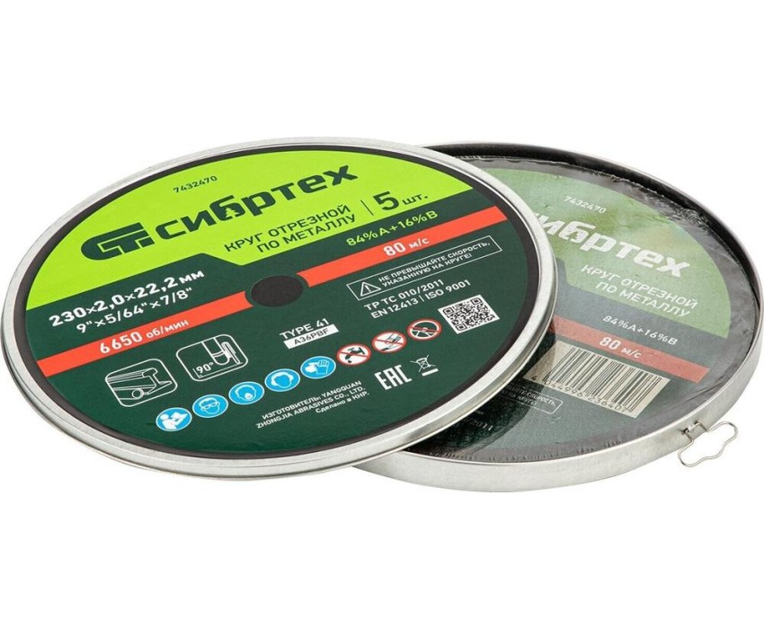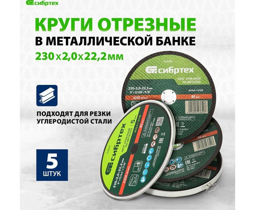 Круг отрезной по металлу Сибртех 84%A+16%B 7432470 диаметром 230 мм и толщиной 2,0 мм, 5 шт. в металлической банке, устанавливается на УШМ с посадочным размером 22,2 мм. Предназначен для сухой резки углеродистых сталей. Набор пригодится частному мастеру для проведения ремонтных работ дома или в гараже, также подойдет для профессионального применения.ПреимуществаБезопасная эксплуатация — двухслойная усиленная сетка повышает устойчивость кругов к разрыву.Увеличенный ресурс — круги изготовлены из электрокорунда нормального и бакелитовой связки средней твердости со специальными добавками.Толщина 2 мм — круг имеет оптимальный баланс прочности и скорости реза.Выгодное приобретение — стоимость набора сопоставима с популярными аналогами российского производства.Надежная упаковка и оптимальный запас — в набор входит 5 отрезных кругов, упакованных в металлическую банку.