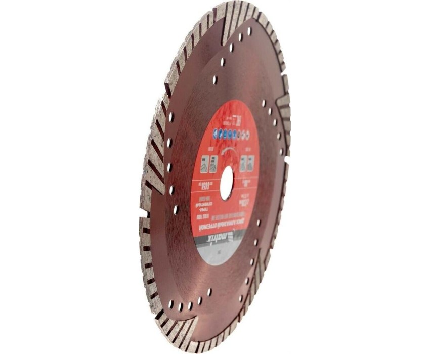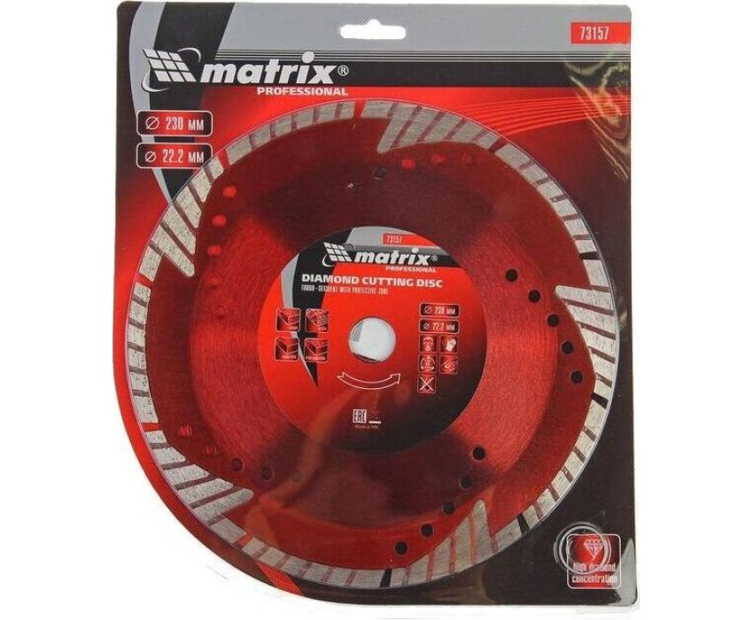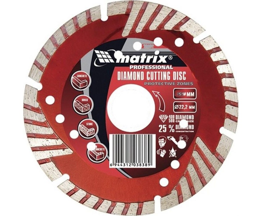 Диск алмазный отрезной сегментный Matrix 73157 с защитными секторами, 230 х 22,2 мм, применяется для сухой резки бетона разной прочности, камня, кирпича, шлакоблока и тротуарной плитки. Он используется как оснастка для углошлифовальных машин с соответствующим посадочным диаметром. Диск изготовлен методом холодного прессования и выдерживает повышенные нагрузки при прохождении арматуры в слабоармированном железобетоне.ПреимуществаСегментная структура рабочей части обеспечивает эффективное охлаждение и отвод пыли, поэтому подача воды не требуется.Защитные секторы предохраняют сегменты диска от преждевременного износа и от налипания шлама.За счет уникальной формы диск позволяет выполнять кратковременную обработку боковой поверхностью без риска поломки.Увеличенная концентрация алмазов и специально подобранная металлическая связка обеспечивают высокий ресурс диска.Благодаря ширине рабочей части 7 мм диск успешно справляется с бытовыми задачами.