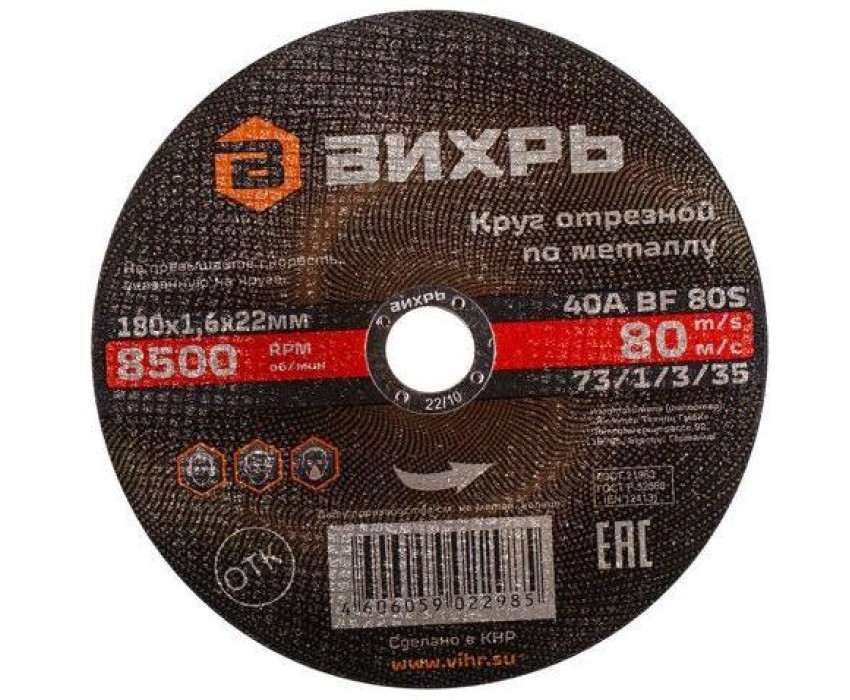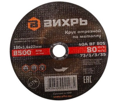 Отрезной диск ВИХРЬ Отрезной диск 73/1/3/35, по металлу, 180мм, 1.6мм, 22.2мм, 25 шт