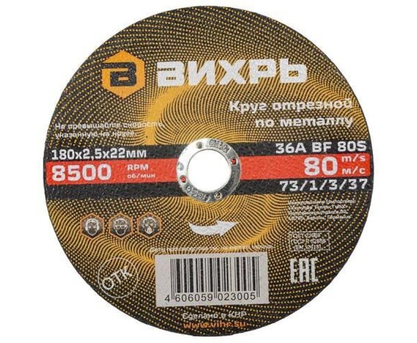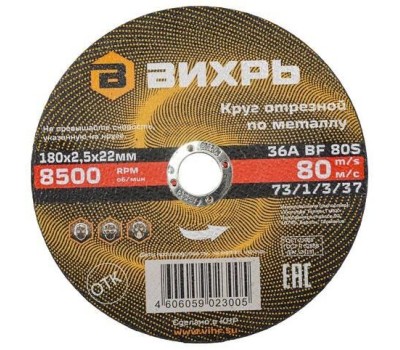 Отрезной диск ВИХРЬ Отрезной диск 73/1/3/37, по металлу, 180мм, 2.5мм, 22.2мм, 25 шт