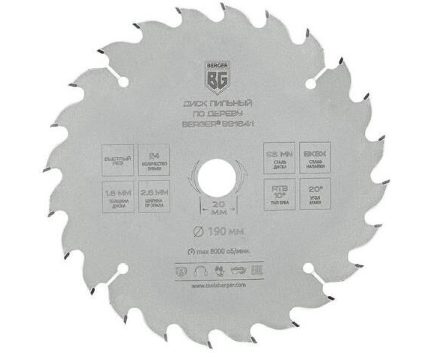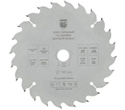 BERGER Пильный диск BG1641, по дереву, 190мм, 1.8мм, 20мм