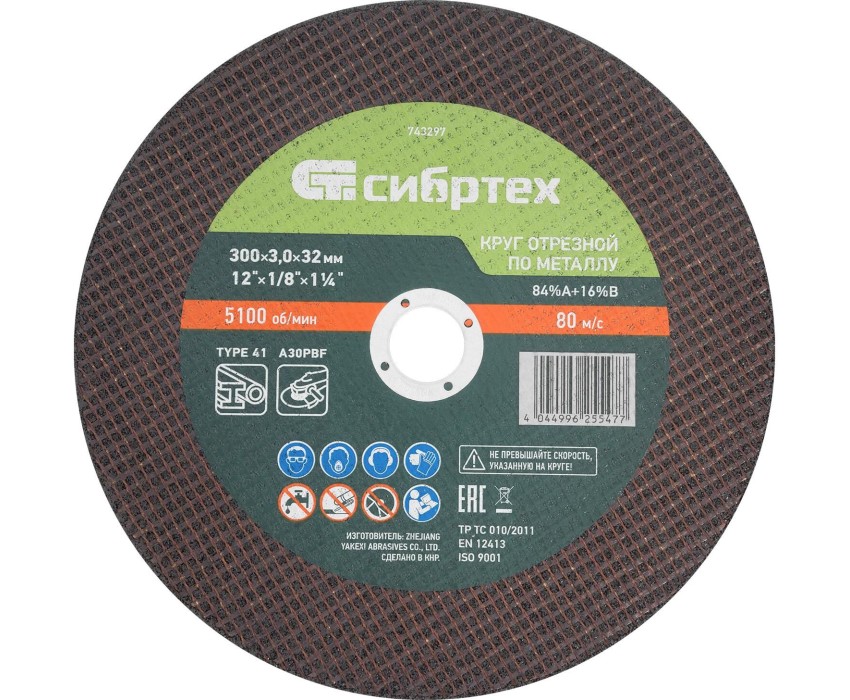 Отрезной круг по металлу Сибртех 84%A+16%B 743297 диаметром 300 мм и толщиной 3,0 мм устанавливается на фланец ручной углошлифовальной машины или станка с посадочным размером 32 мм. Предназначен для работы по металлу, оптимален для резания углеродистых сталей. Диск используется только для сухого реза, максимальная частота вращения составляет 5100 об/мин. Пригодится в мастерской, будет также полезен в быту. Преимущества Высокие абразивные свойства — твердые зерна электрокорунда нормального позволяют быстро резать заготовки. Прочность — двухслойная усиленная сетка повышает стойкость круга к разрыву, обеспечивая безопасность работы. Стабильная производительность — благодаря бакелитовой связке абразивный слой не разрушается при работе на высокой скорости Долговечность — оснастка толщиной 3,0 мм легко и аккуратно режет сталь, позволяя получить ровную кромку без дефектов.