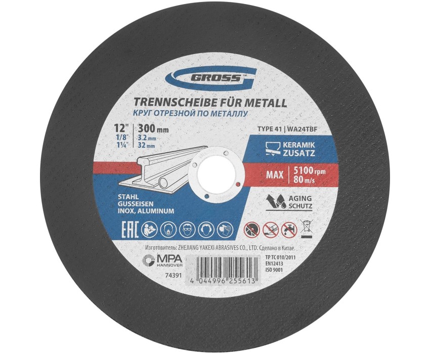 Отрезной круг по металлу Gross WA24TBF 74391 диаметром 300 мм и толщиной 3,2 мм устанавливается на фланец углошлифовальной машины или станка с посадочным размером 32 мм. Рассчитан на интенсивный сухой рез углеродистых и нержавеющих легированных сталей, алюминия, чугуна. Рекомендованная максимальная частота вращения составляет 5100 об/мин. Круг выдерживает высокие нагрузки, подходит для профессиональной эксплуатации с высокими нагрузками. Преимущества Эффективная работа — абразив отличается высокой режущей способностью, диск толщиной 3,2 мм изнашивается медленно и долго не требует замены. Безопасная работа — высококачественная двухслойная стеклосетка защищает круг от перегрузок, предотвращая его разрушение в случае зажатия в материале. Очень высокий ресурс — абразив и бакелитовая связка со специальными добавками рассчитаны на длительное использование, керамический корунд в составе увеличивает срок службы круга на 15%. Надежность — круг изготовлен с использованием технологии Aging Sсhutz, препятствующей впитыванию влаги, благодаря чему сохраняет изначальные характеристики на 40% дольше. Минимум искр и пыли — в процессе реза оснастка слабо нагревается, а изнашивается медленно и равномерно. Стабильная и точная работа — круг с плотной равномерной структурой прошел дополнительное тестирование на дисбаланс. Проверенное качество — оснастка успешно прошла контроль на всех этапах производства, что подтверждено ганноверским и российским сертификатами безопасности.