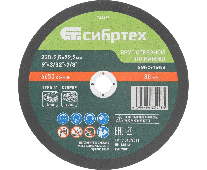 Отрезной круг Сибртех 84%C+16%B 743697 диаметром 230 мм и толщиной 2,5 мм — оснастка для ручной углошлифовальной машины с посадочным размером 22,2 мм, предназначенная для сухого реза камня, огнеупорного кирпича, бетонных изделий, керамической плитки. Использования смазочно-охлаждающих жидкостей не требуется. Диск обеспечивает эффективный рез при частоте вращения не более 6650 об/мин. Пригодится в быту, частной мастерской или на небольшом производстве. Преимущества Высокая производительность и аккуратный рез — абразивные зерна из карбида кремния имеют острые грани и легко справляются с твердыми материалами. Безопасная работа — надежная двухслойная стеклосетка увеличивает устойчивость круга к разрыву при высоких нагрузках. Высокий ресурс — бакелитовая связка с упрочняющими элементами надежно удерживает зерна абразива. Надежность — круг изготовлен на высококачественном оборудовании по современной технологии.