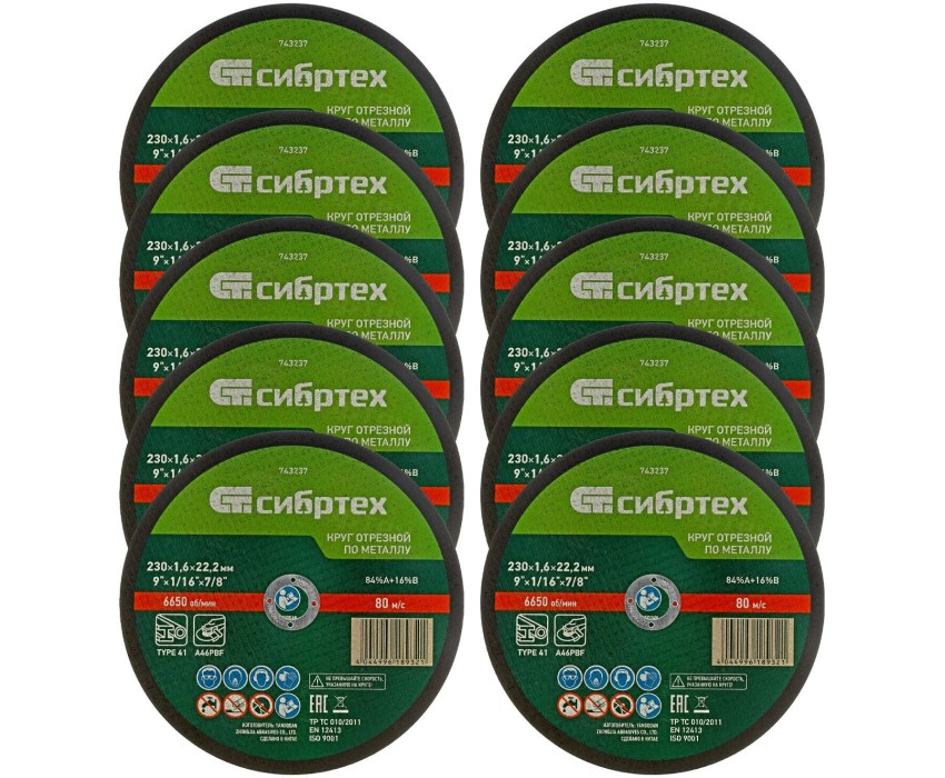 Отрезной круг по металлу Сибртех 84%A+16%B 743233 размером 230 х 1,6 мм устанавливается на фланец ручной углошлифовальной машины с посадочным размером 22,2 мм. Предназначен для сухой резки углеродистых сталей, пригодится для проведения ремонтных работ дома или в гараже. Преимущества Высокие абразивные свойства — твердые зерна электрокорунда нормального позволяют быстро резать заготовки. Прочность — двухслойная усиленная сетка повышает стойкость круга к разрыву, обеспечивая безопасность работы. Стабильная производительность — благодаря бакелитовой связке абразивный слой не разрушается при работе на высокой скорости. Долговечность — оснастка толщиной 1,6 мм легко и аккуратно режет сталь, позволяя получить ровную кромку без дефектов. Большой запас — 10 кругов в наборе хватит для выполнения большого объема работ.