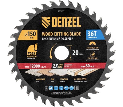 DENZEL Пильный диск по дереву ф150 х 20 мм, 36 зубов, тонкий 733037