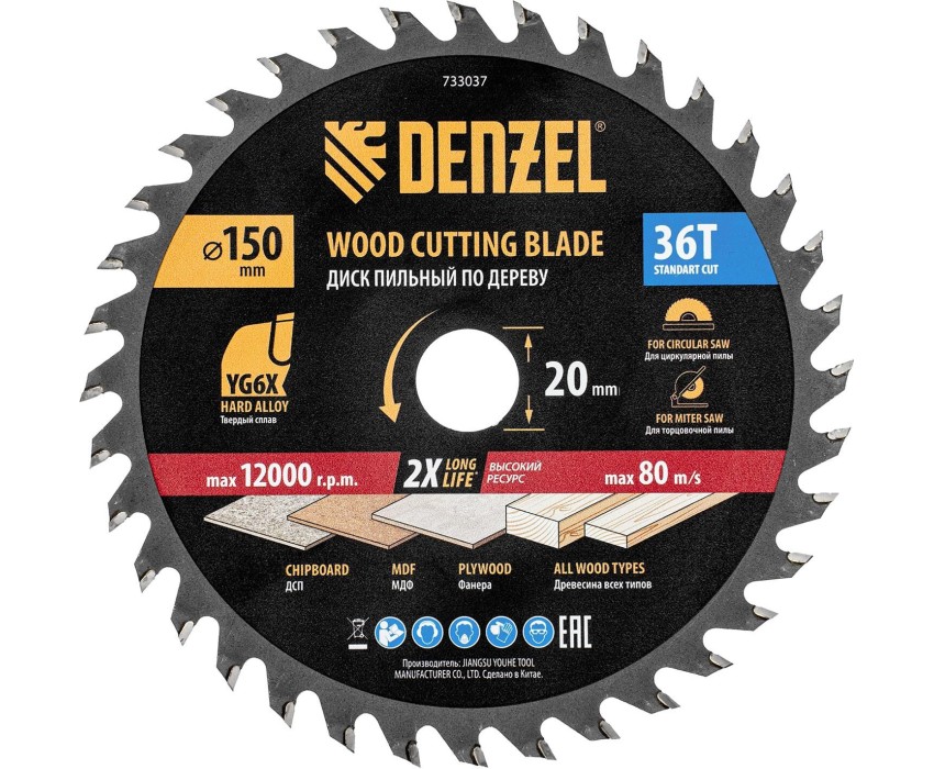 Тонкий пильный диск Denzel 733037 диаметром 150 x 20 мм, с 36 зубьями, устанавливается на циркулярную, торцовочную пилу или распиловочный станок и предназначен для выполнения работ по дереву. Подходит для распиливания древесины любого типа, а также фанеры, ДСП, МДФ. Зубья типа ATB обеспечивают высокое качество и скорость как продольного, так и поперечного распила. Тип реза — стандартный. Толщина диска уменьшена, что повышает производительность и снижает нагрузку на инструмент. На зубья напаяны твердосплавные пластины, длительное время сохраняющие режущую способность. Пластины из твердого сплава YG6X прошли многоступенчатую заточку, что позволило достичь оптимальной геометрии и максимальной эффективности распиловки. Преимущества Надежность — режущие пластины крепко зафиксированы методом пайки с использованием высококачественного термостойкого припоя, содержащего повышенное количество серебра. Долговечность — корпус изготовлен из пружинной стали 65Mn и прошел термическую обработку, поэтому выдерживает повышенные нагрузки. Высокое качество выполняемых работ — благодаря компенсационным прорезям диск не деформируется при нагрузках, обеспечивая стабильно ровный рез. Защита от разрушения — корпус покрыт лаком, переходное кольцо никелировано для предотвращения образования коррозии. Дополнительные возможности — входящее в комплект поставки переходное кольцо с 20 на 16 мм позволяет изменить посадочный размер при необходимости.