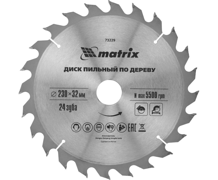 Пильный диск по дереву Matrix 73229 диаметром 230 х 32 мм, с 24 зубьями и переходным кольцом 32/30, — оснастка для циркулярных и торцовочных пил с соответствующим посадочным и внешним диаметром. Используется для продольного/поперечного реза материалов из мягкой и твердой древесины, ДСП, ДВП, фанеры, столярных плит. В комплект поставки входит переходное кольцо 32/30, позволяющее самостоятельно изменить посадочный диаметр при необходимости. Диск подходит для бытового и профессионального применения. Преимущества Прочность и высокий ресурс — основание изготовлено из стали 65Mn, режущие пластины выполнены из сплава ВК6 твердостью более 88 HRA, зубья прошли алмазную заточку. Стабильная работа — компенсационные прорези снижают риск заклинивания диска. Быстрый рез — крупные зубья с попеременной заточкой обеспечивают высокую скорость работы. Надежность — твердосплавные пластины закреплены методом пайки с использованием улучшенного медного припоя.
