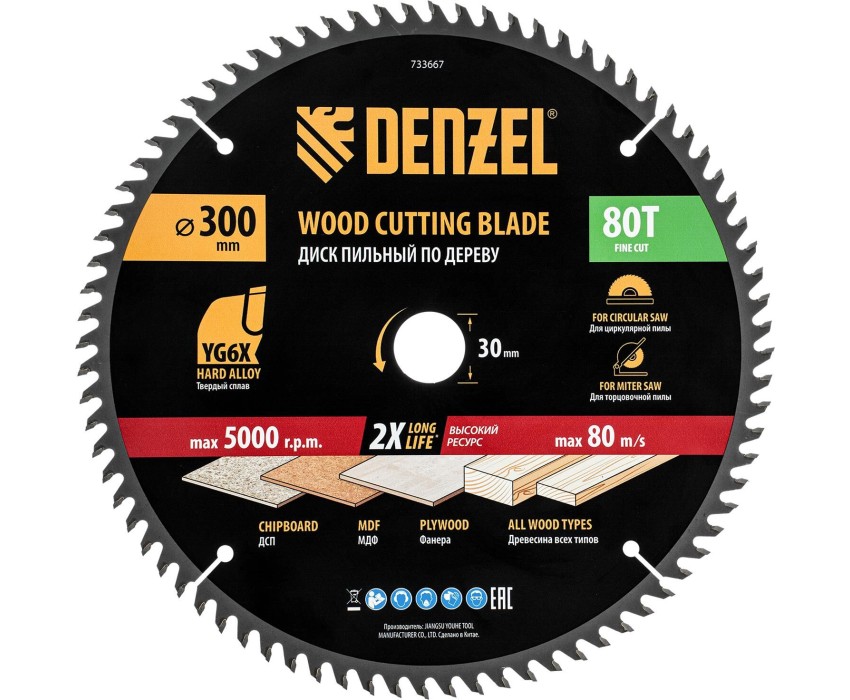Пильный диск Denzel 733667 диаметром 300 x 30 мм, с 80 зубьями, предназначен для точного продольного и поперечного распила твердой и мягкой древесины, фанеры, МДФ, ДСП. 80 зубьев типа ATB с режущими пластинами оптимальной геометрии обеспечивают максимально чистый рез. Режущие пластины из твердого сплава YG6X сохраняют рабочие свойства при интенсивном использовании. Диск устанавливается на циркулярную, торцовочную пилу или на распиловочный станок. В комплект поставки входит переходное кольцо с 30 на 20 мм, что позволяет изменить посадочный размер и расширяет возможности использования диска. Преимущества Надежность — режущие пластины крепко зафиксированы методом пайки с использованием высококачественного термостойкого припоя, содержащего повышенное количество серебра. Долговечность — корпус изготовлен из пружинной стали 65Mn и прошел термическую обработку, поэтому выдерживает повышенные нагрузки. Высокое качество выполняемых работ — благодаря компенсационным прорезям диск не деформируется при нагрузках, обеспечивая стабильно ровный рез. Защита от разрушения — корпус покрыт лаком, переходное кольцо никелировано для предотвращения образования коррозии.