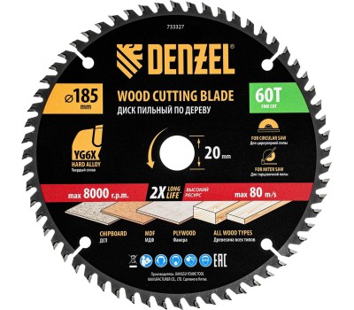 DENZEL Пильный диск по дереву ф185 х 20 мм, 60 зубьев 733327