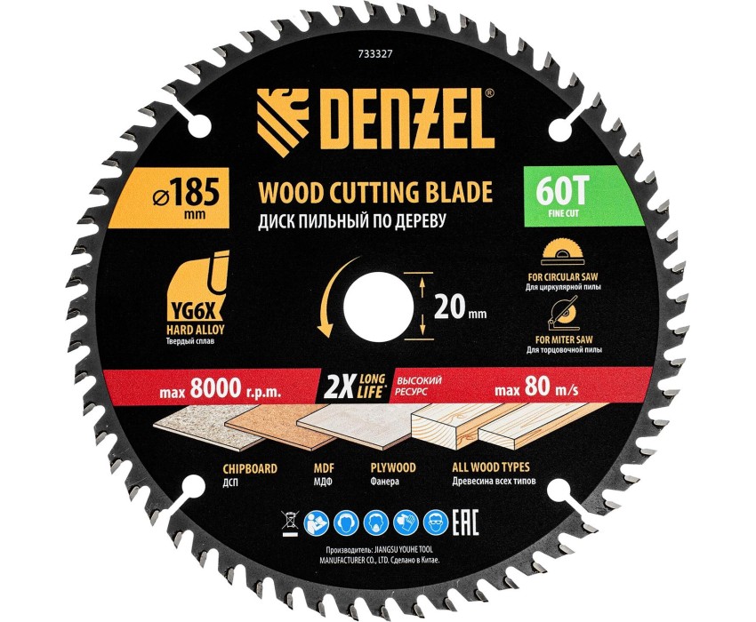 Пильный диск Denzel 733327 диаметром 185 x 20 мм, с 60 зубьями, предназначен для точного продольного и поперечного распила твердой и мягкой древесины, фанеры, МДФ, ДСП. 60 зубьев типа ATB с режущими пластинами оптимальной геометрии обеспечивают чистый рез. Режущие пластины из твердого сплава YG6X сохраняют рабочие свойства при интенсивном использовании. Диск устанавливается на циркулярную, торцовочную пилу или на распиловочный станок. В комплект поставки входит переходное кольцо с 20 на 16 мм, что позволяет изменить посадочный размер и расширяет возможности использования диска. Преимущества Надежность — режущие пластины крепко зафиксированы методом пайки с использованием высококачественного термостойкого припоя, содержащего повышенное количество серебра. Долговечность — корпус изготовлен из пружинной стали 65Mn и прошел термическую обработку, поэтому выдерживает повышенные нагрузки. Высокое качество выполняемых работ — благодаря компенсационным прорезям диск не деформируется при нагрузках, обеспечивая стабильно ровный рез. Защита от разрушения — корпус покрыт лаком, переходное кольцо никелировано для предотвращения образования коррозии.